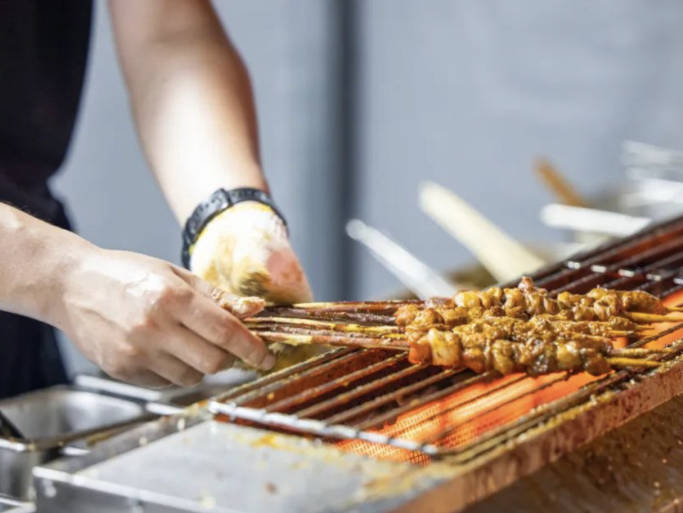 在车都金盾大酒店的夜市,烤串在烤炉上滋滋作响。(武汉经开区融媒体中心供图)