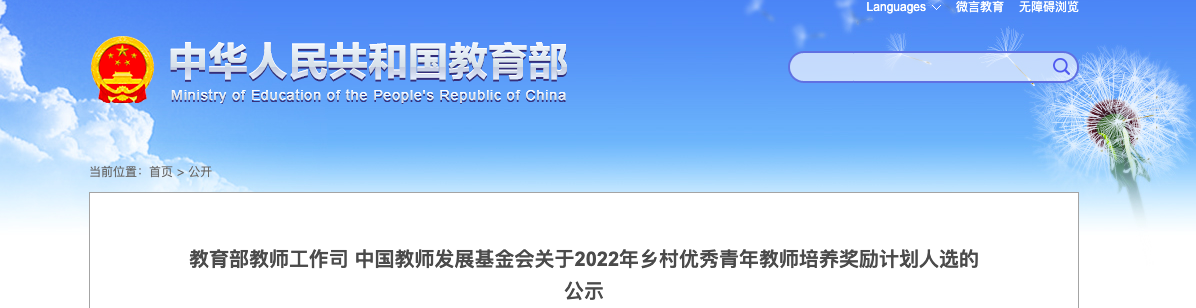 教育部教师工作司 中国教师发展基金会关于2022年乡村优秀青年教师培养奖励计划人选的公示