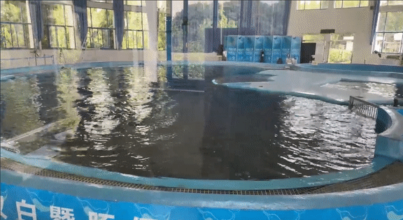 直播期间非常幸运捕捉到了江豚跃出水面的精彩画面。当镜头从直播间转到繁殖厅的大水池时,洋洋和yyc活跃起来,一前一后跃出水面,黑灰色的身体如绸缎般丝滑,它们跳出水面,溅起水花。