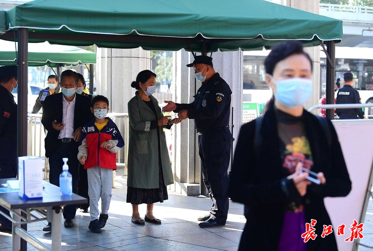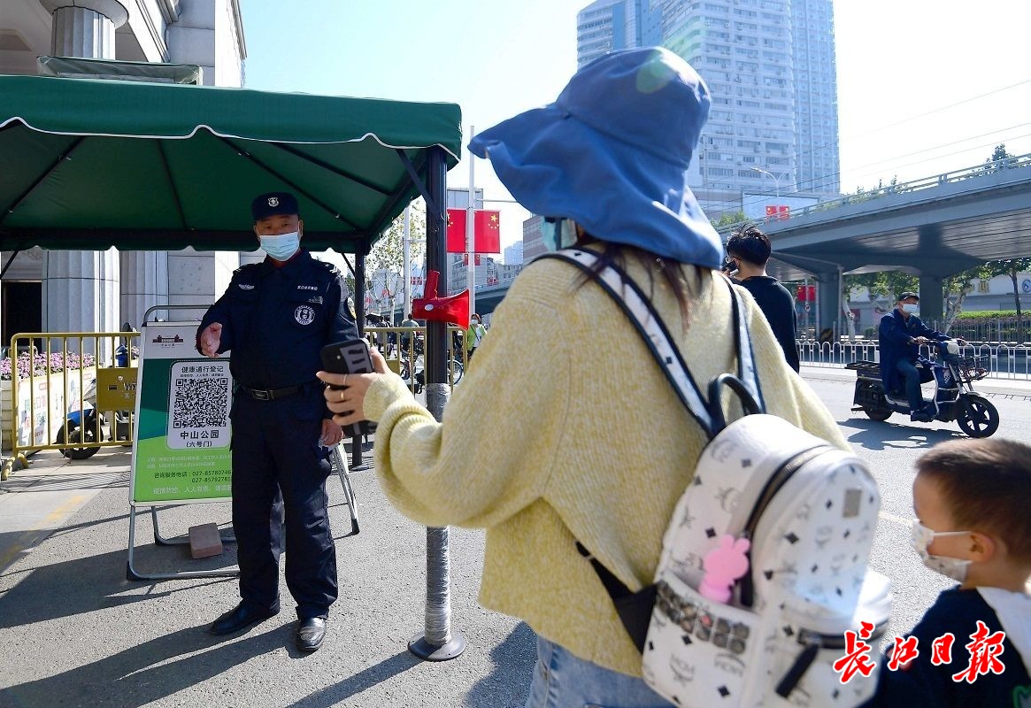 长江日报大武汉客户端10月15日讯 10月15日是周六,天气晴朗且凉爽,武汉各公园都迎来了一次客流小高峰。长江日报记者现场探访看到,市民游客已经养成了戴口罩、主动亮“绿码”的习惯,在园方门岗工作人员的严格查验和耐心引导下,双方合力筑起一道疫情防控严密防线,共护游园安全。