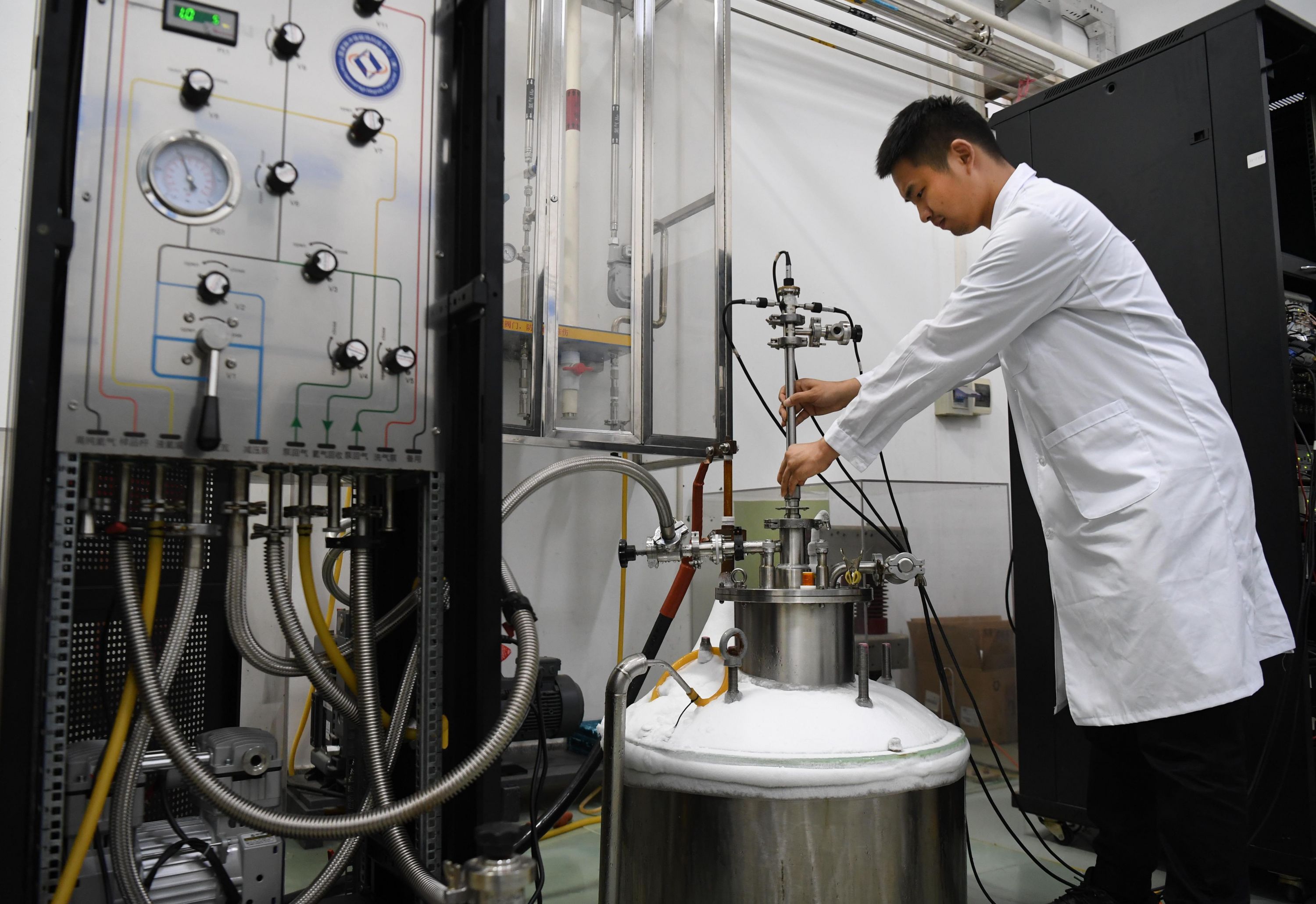 国家脉冲强磁场科学中心科研人员在科学实验站工作。 记者高勇 摄