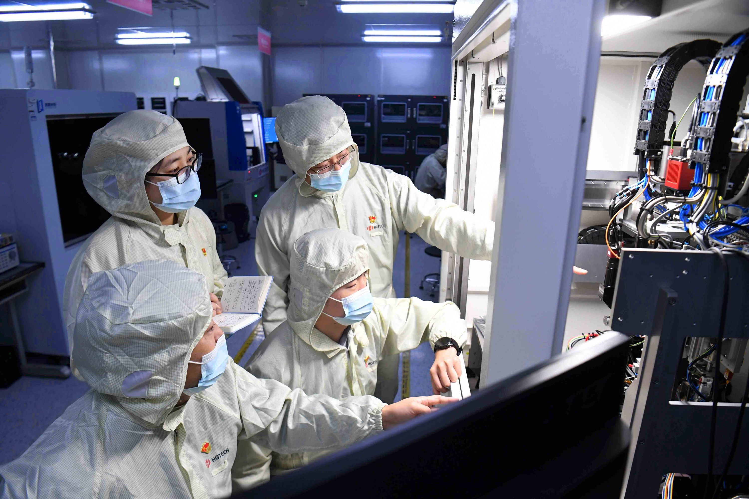 华工科技研发工程师在实验室研讨自主硅光芯片的封装工艺。 记者高勇 通讯员俞智君 摄