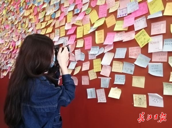 女孩留言后,拍照留作纪念。 记者王春岚 摄