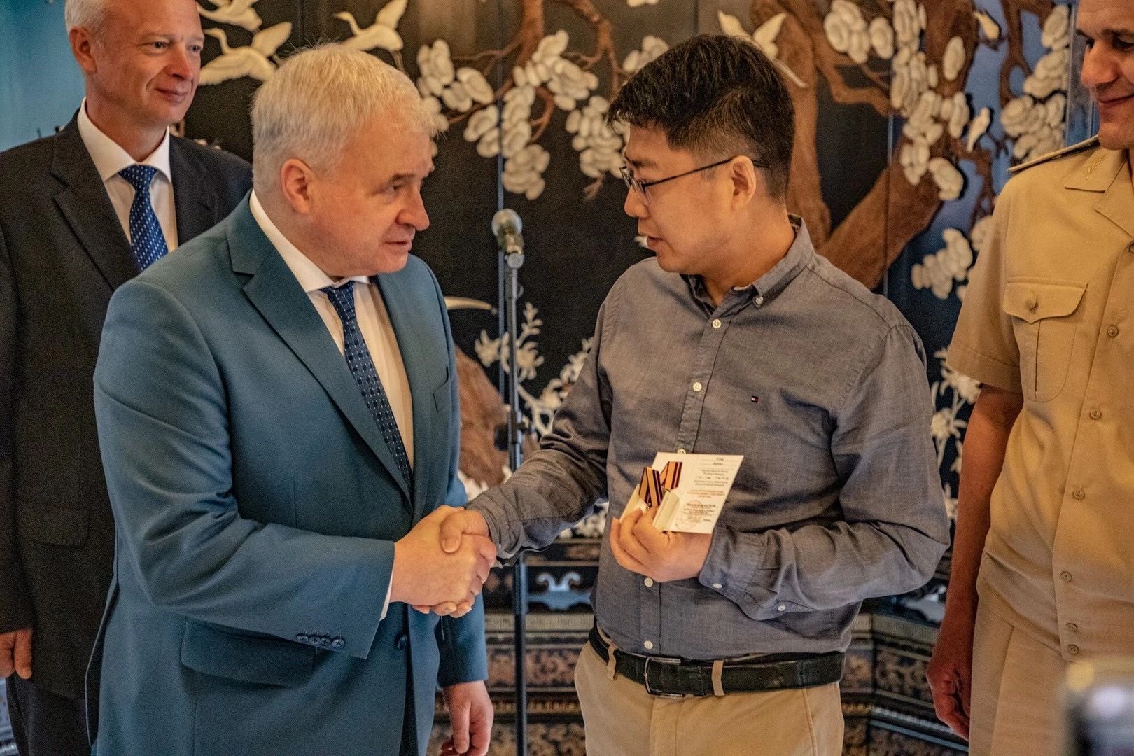 2020年9月10日,俄罗斯驻华大使馆隆重举行“纪念奖章”授颁仪式,俄罗斯驻华大使安德烈·杰尼索夫向长江日报记者谌达军颁授了“俄罗斯国防部纪念保卫祖国烈士贡献奖章”。该奖章由俄罗斯国防部长绍伊古签发。