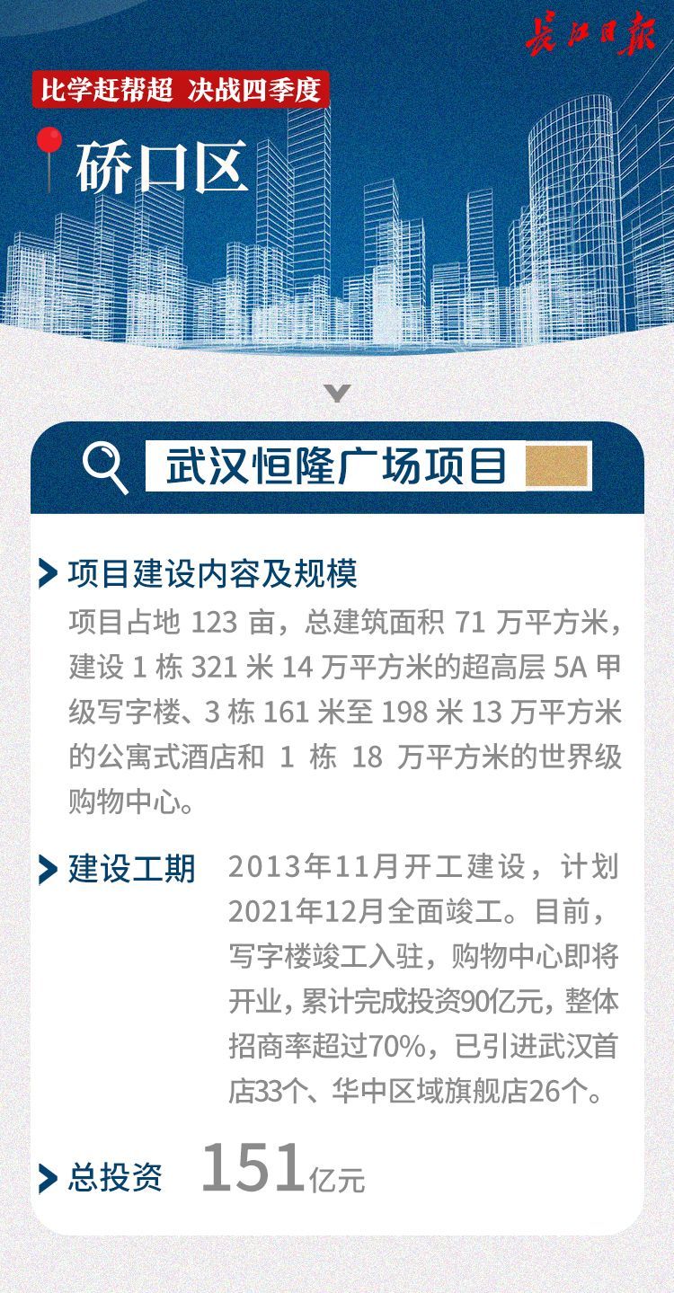 据了解,该项目由香港恒隆集团投资151亿元开发建设,是武汉市在建最大的商业地产项目,计划2021年12月全面竣工。项目占地123亩,总建筑面积71万平方米,建设1栋321米超高层5A甲级写字楼、3栋161米至198米超高层公寓式酒店和1栋6层50米高的世界级购物中心。