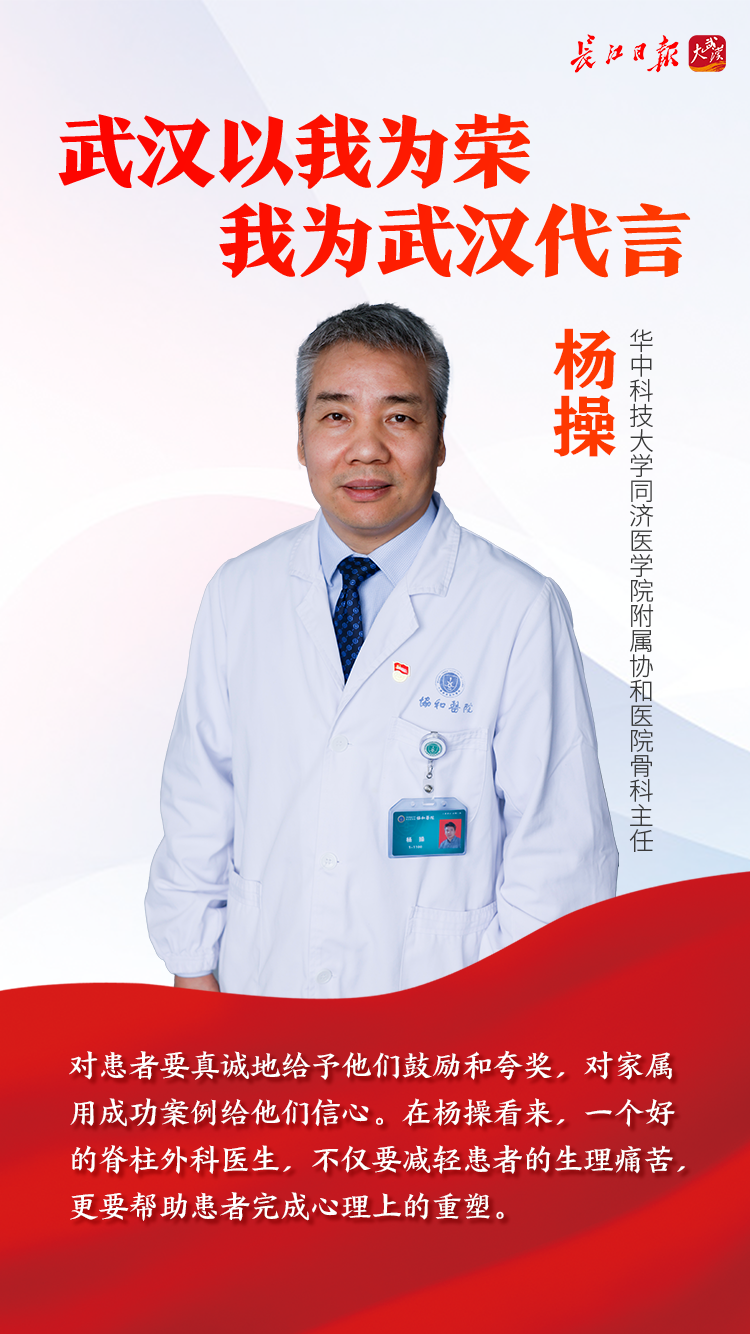 “武汉以我为荣,我为武汉代言。”做骨科医生近三十年,杨操坚持在脊柱外科领域深耕,脊柱侧弯、腰椎管狭窄症、脊柱骨折……他攻克了一个又一个骨科技术难题。党的二十大报告指出,深入开展健康中国行动和爱国卫生运动,倡导文明健康生活方式。“群众对脊柱疾病的重视程度还不够。”杨操表示,未来,自己将致力于提高全社会对脊柱疾病的认知水平,通过开展讲座、交流、科普等活动,增强群众的健康意识,帮助更多人培育文明健康生活方式,让骨科疾病能够被早发现、早治疗,为推进健康中国、健康武汉建设贡献自身的力量。