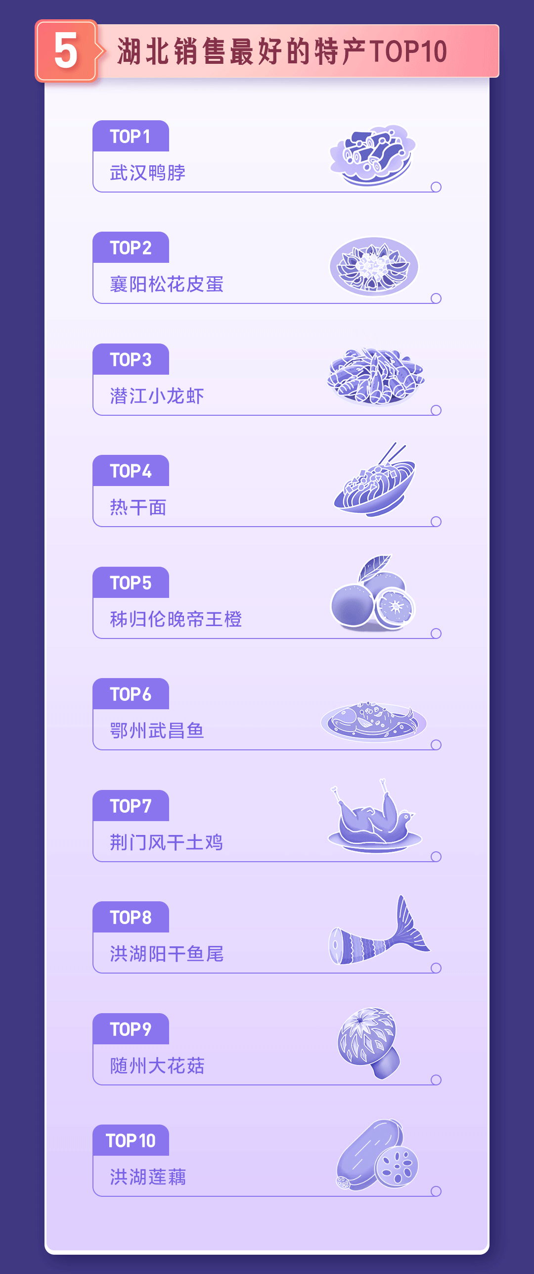 湖北销量最好的十大特产里鸭脖名列第一,此外襄阳松花皮蛋、潜江小龙虾、秭归伦晚橙、随州大花菇等等,借助抖音电商的力量,走进了大众视野,被越来越多人喜爱。