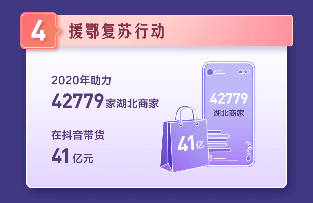 2020年全年,抖音共助力42779家湖北商家带货41亿元,助力湖北经济复苏。