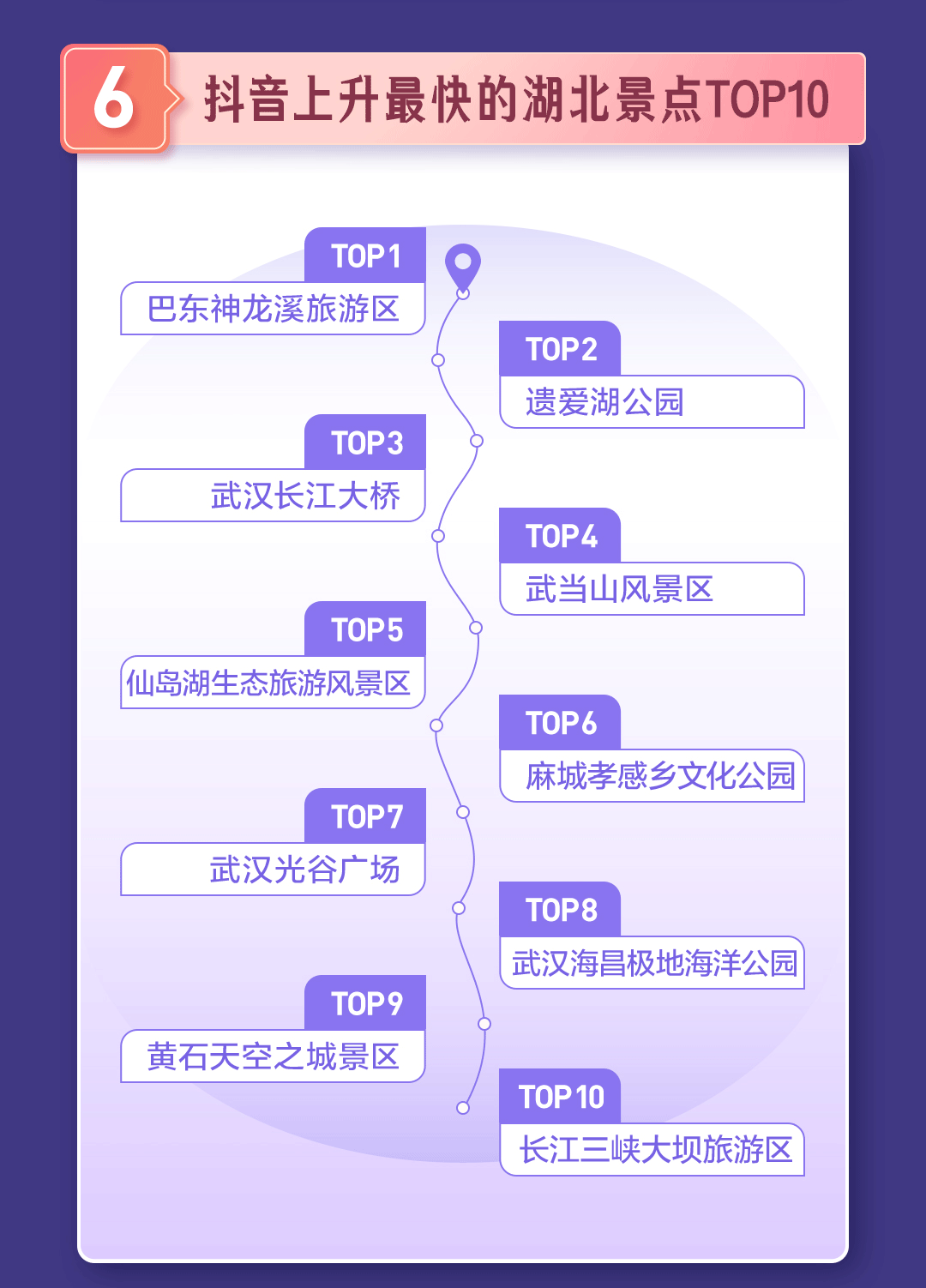 过去一年,抖音上湖北上升最快的十大景点包括巴东神农溪旅游区、遗爱湖公园、武当山风景区、仙岛湖生态旅游风景区、麻城孝感乡文化公园等等。