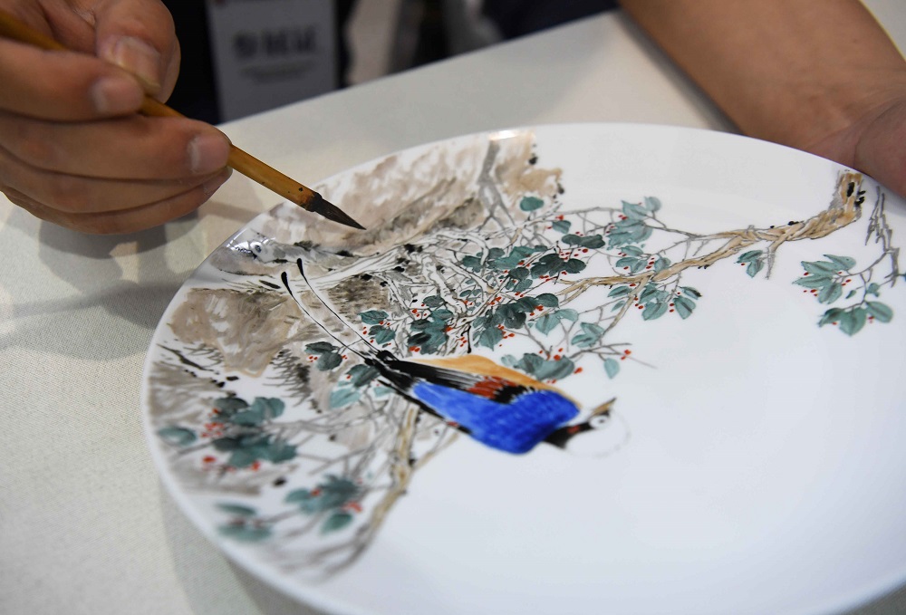 江西吉州窑烧制技艺代表性传承人伍映山展示木叶纹黑陶瓷。