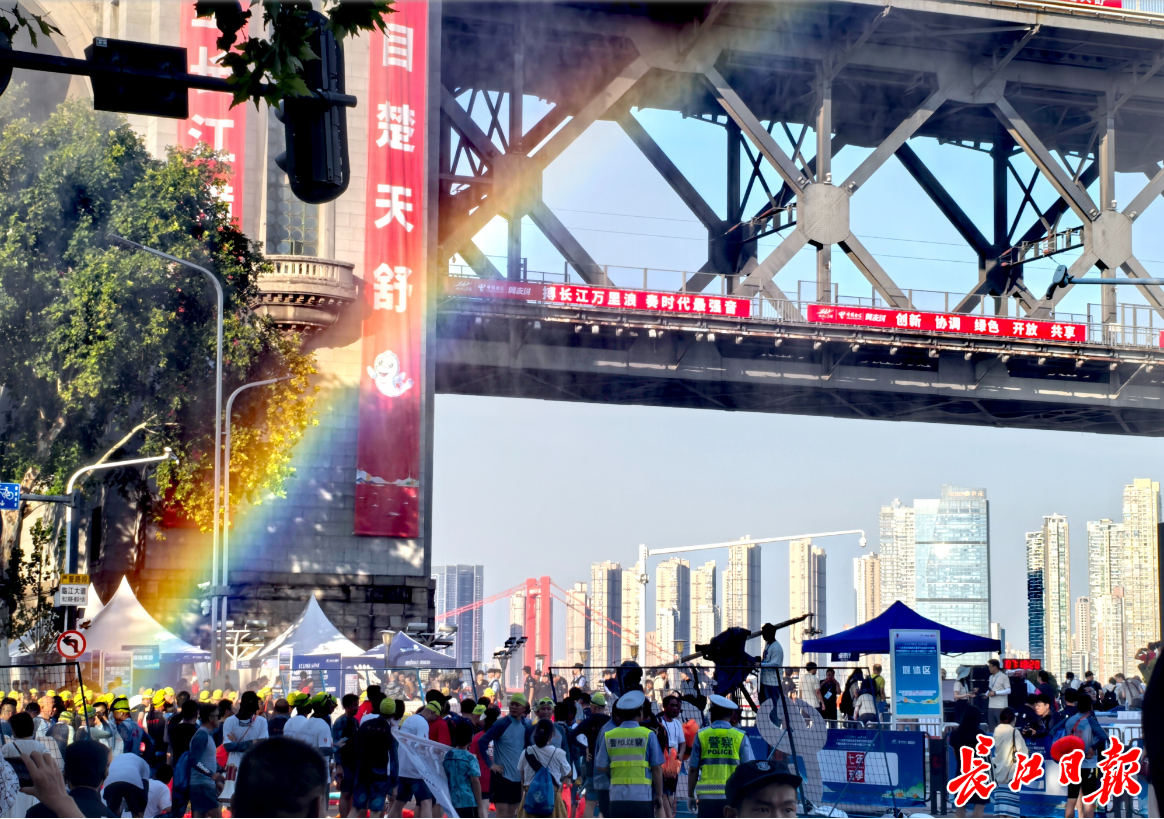 下水点旁停着一辆洒水车,从7时许开始间断性向天空洒水,给排队等候的方队送去清凉。由于天气晴好,洒出的水柱在空中制造了一道彩虹,与不远处的武汉长江大桥相映成趣。一些方队中的选手笑着说:“这么多人来加油,还有彩虹相伴,今天肯定能游出好成绩。”