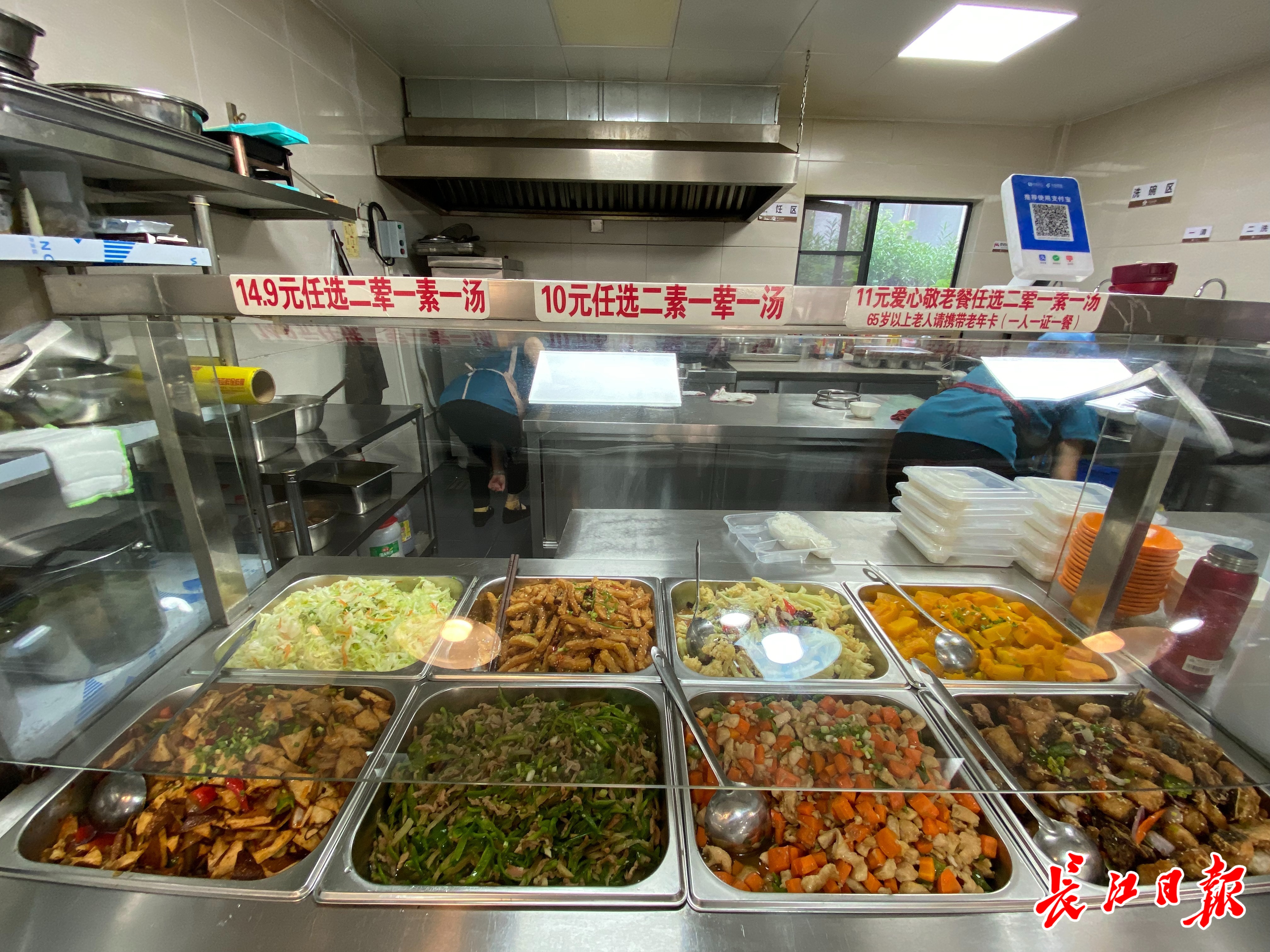 中餐有胡萝卜鸡丁、糍粑鱼、香干回锅肉、干烧花菜、老南瓜等四荤四素和绿豆汤,出菜窗口上明码标价:10元两素一荤一汤、14.9元两荤一素一汤,65岁以上老人凭老年卡可吃11元爱心敬老餐;另有小碗菜,素菜6元—8元/份,荤菜10—12元/份,汤免费。