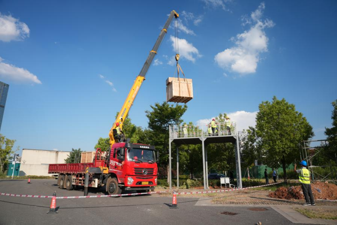 在新月溪公园的机库部署现场,工程师们和施工人员顶着烈日作业。(企业提供)