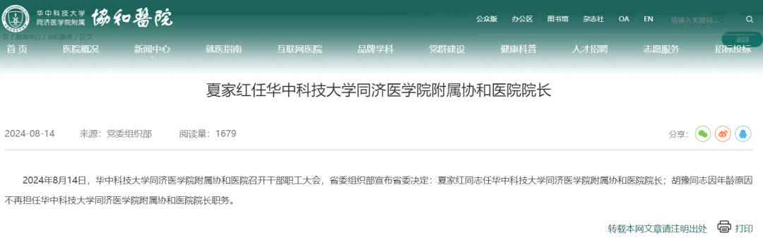 2024年8月14日,华中科技大学同济医学院附属协和医院召开干部职工大会,省委组织部宣布省委决定:夏家红同志任华中科技大学同济医学院附属协和医院院长;胡豫同志因年龄原因不再担任华中科技大学同济医学院附属协和医院院长职务。