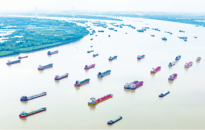 2024年6月1日,船舶在湖北省武汉市阳逻港区水域行驶(无人机照片)。 新华社记者杜子璇 摄