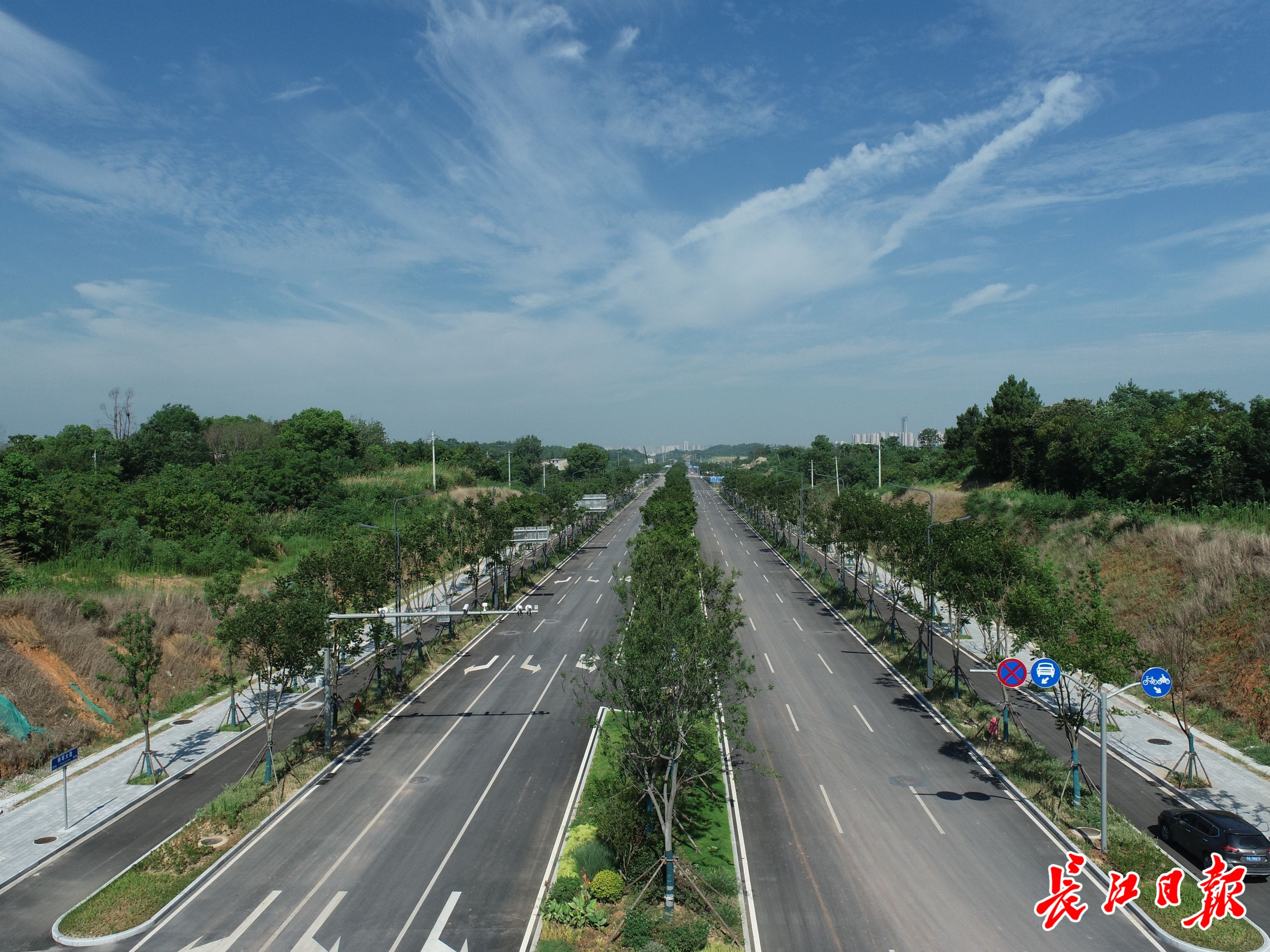 8月23日下午,长江日报记者驱车走马湖路向北进入将军大道,一路向东,先后抵达将军大道延长线、综保路、吴楚大道。只见宽阔平坦的路面由高等沥青铺就,黑底平滑。机动车道、绿化带、自行车道、人行道分隔十分清晰,道路白色标线清晰醒目。路边的路灯杆整齐排列,造型简约而现代。道路中间和两旁绿化带,分别是高大挺拔的香樟、法桐、无患子、朴树,四五米高,错落有致。