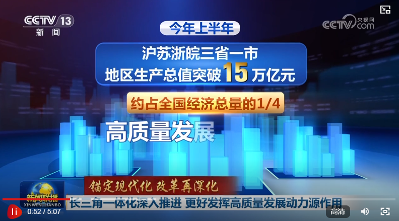 长三角地区是我国经济发展最活跃、开放程度最高、创新能力最强的区域之一。今年上半年,沪苏浙皖三省一市地区生产总值突破15万亿元,约占全国经济总量的四分之一,高质量发展动能强劲。