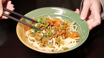 热干面到手第一件事,拌!武汉话念作“笨”,拌的动作要麻利,要不然就坨了,武汉人称之为“憨了”。“热干面要快点笨,不然一哈就憨了。”