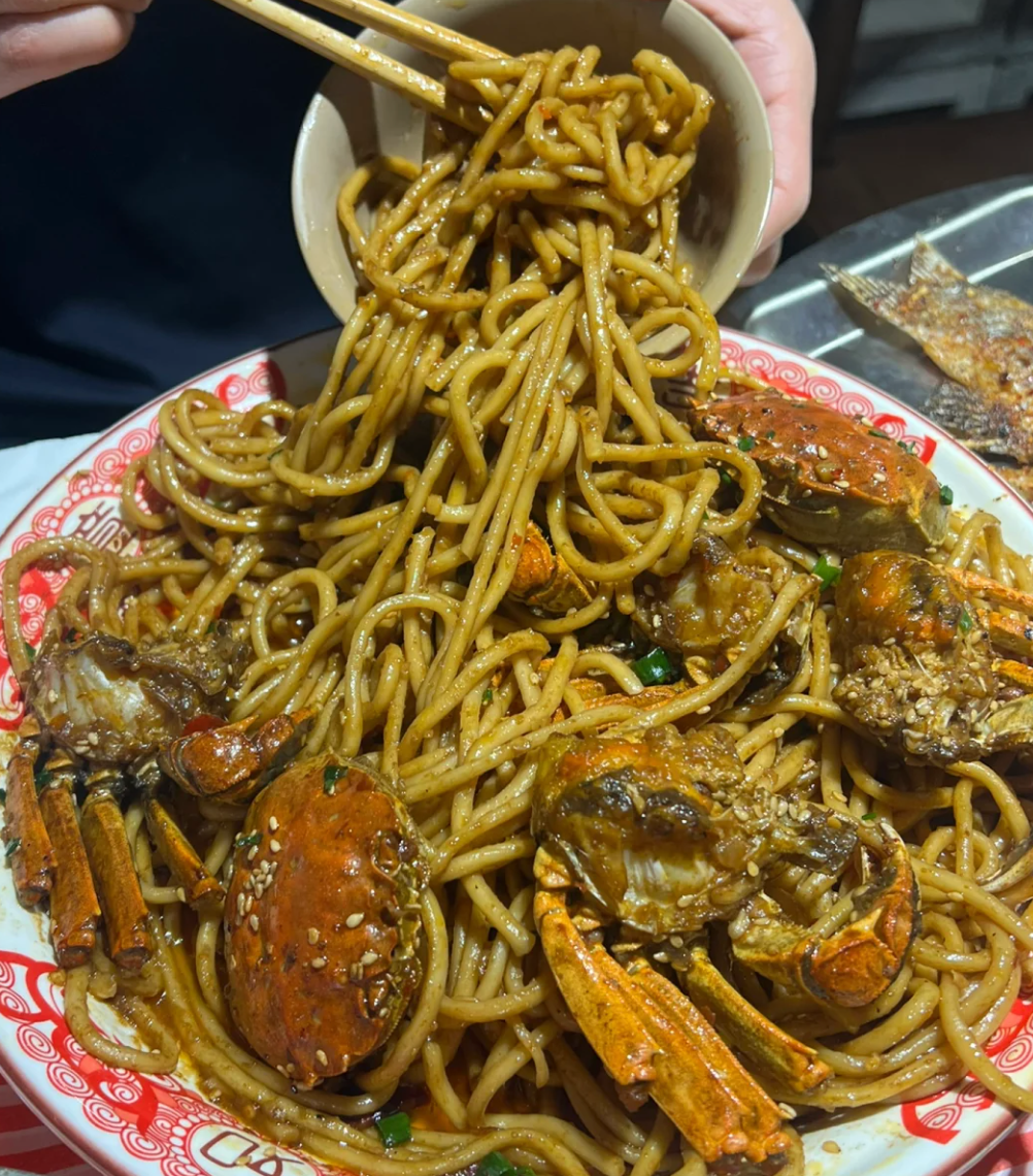 香辣蟹+蟹脚面秋天一到,就要吃蟹脚面和香辣蟹了。吃蟹后剩下的汤汁和面条汇成一碗蟹脚面,也是武汉特色。