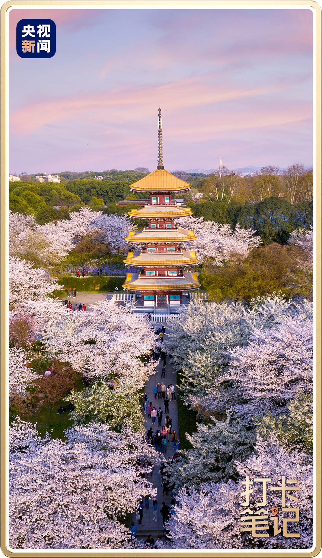 △东湖樱园有万余株樱花,是“世界三大樱园”之一。地标五重塔被樱花层层包围,樱花飘落时,如梦似幻。