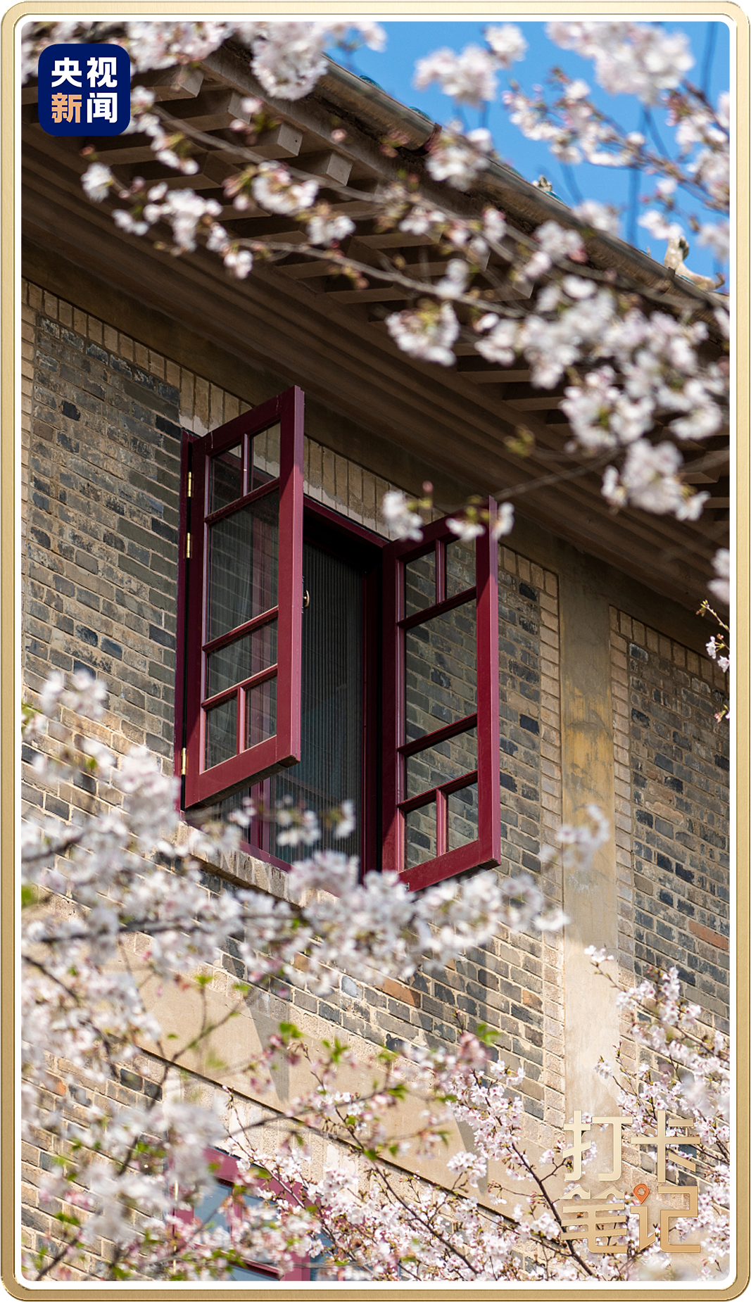 拍摄樱花的绝佳位置之一是武大樱顶,老斋舍的窗扉映着春光,古朴而素雅。