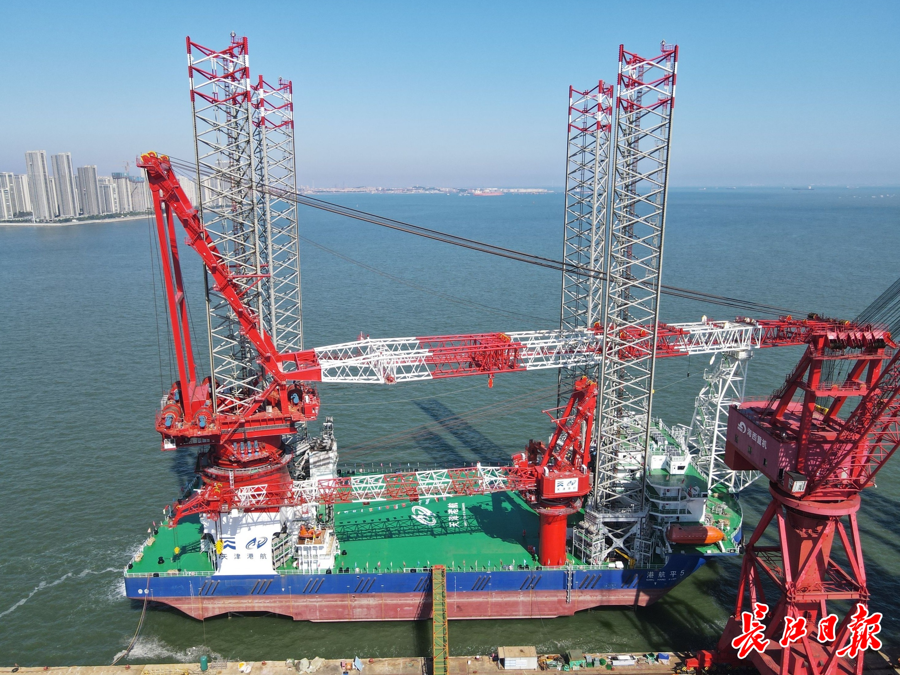 长江日报记者在平台交付现场看到,长135米、宽50米的“港航平5”形如一艘巨轮,上面既有起重机又有平台升降系统。现场工作人员介绍,该平台是目前国内起重综合能力最强、起升高度最高、升降桩腿最长的自航自升式海上风电施工平台,最大起重能力1800吨,最大作业水深70米以上,可航行至岸边向外3000海里的海域。