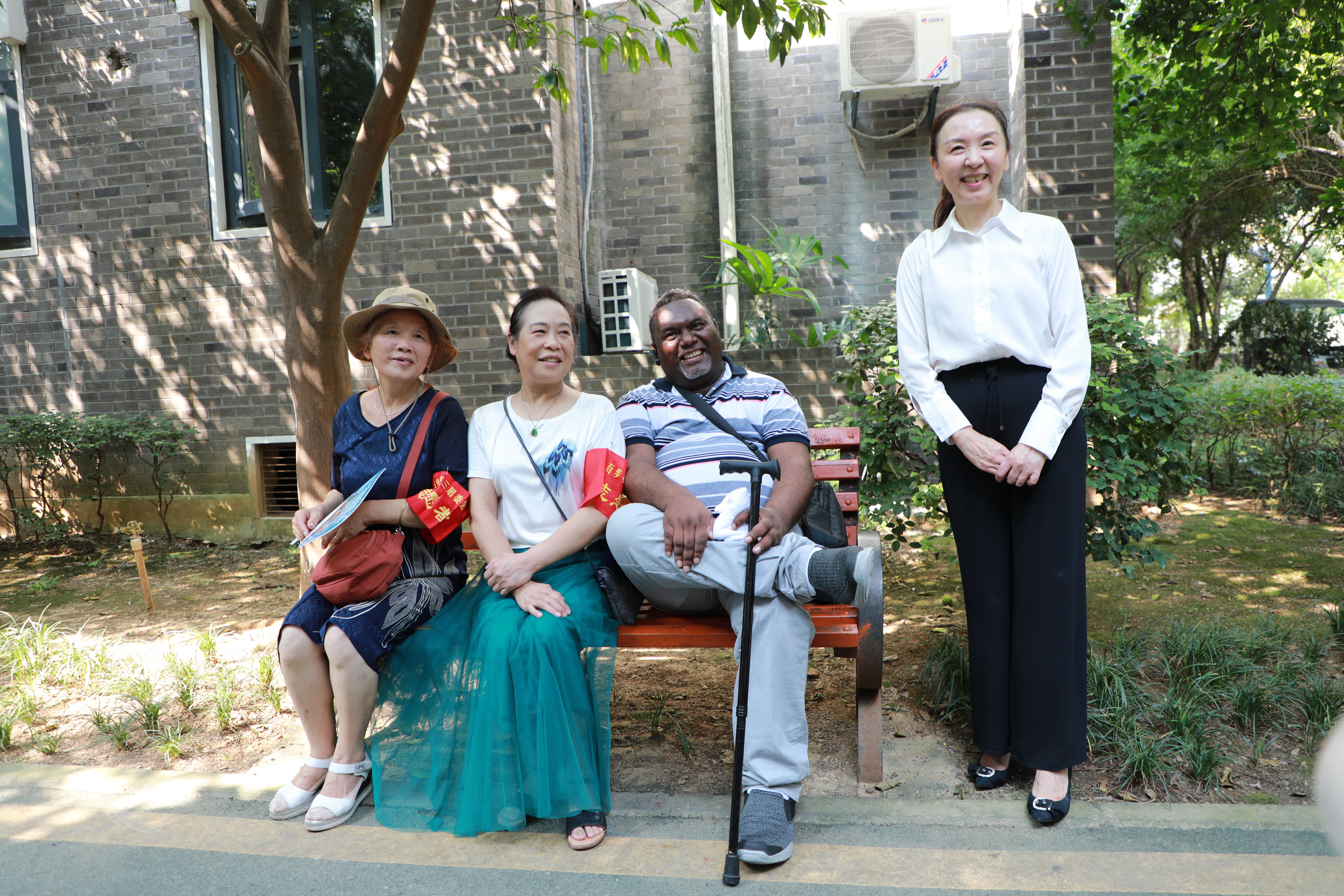 8月24日上午,考察团一行走进全国文明社区示范点百步亭社区的怡康苑北区。此时艳阳高照,走在小区的林荫道上让人感觉凉快不少。这时对面走来两位戴“志愿者”红臂袖的阿姨,她们热情地邀请“我们的党”官员威尔森·拉诺在树下的椅子上小憩,并与他交流自己的社区工作心得。