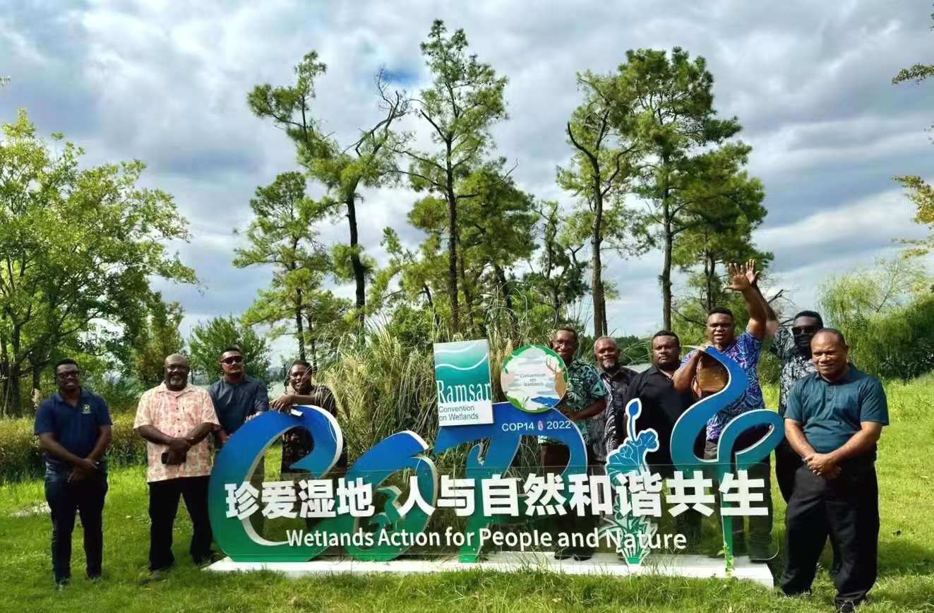 在中国履行《湿地公约》30周年成就展示馆前合影。杨南希 摄