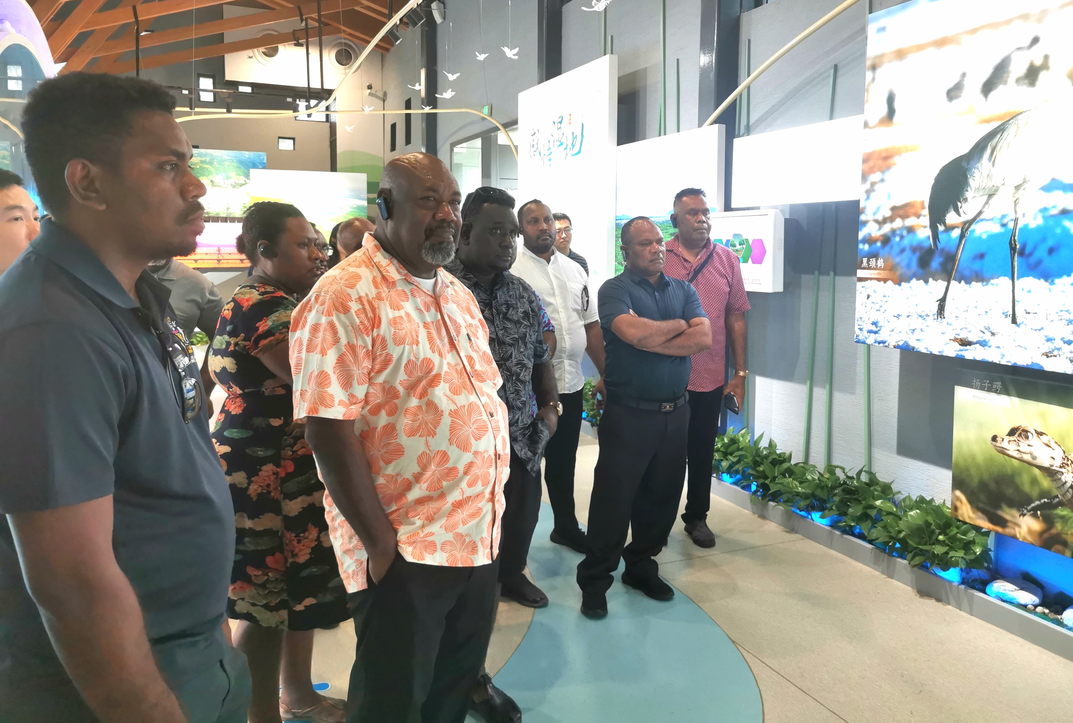 8月27日下午,考察团一行走进展示馆,倾听百鸟齐鸣,俯身轻嗅植物幽香,伸手触摸湿地盲盒,从“色、声、香、味、触、法”六感来认识湿地。在“色”感展区,智能摄像头实时捕捉识别考察团成员的衣服颜色,并在LED屏幕上同步呈现与衣服同色调的动植物画面,新奇有趣的互动形式令考察团成员啧啧称奇。