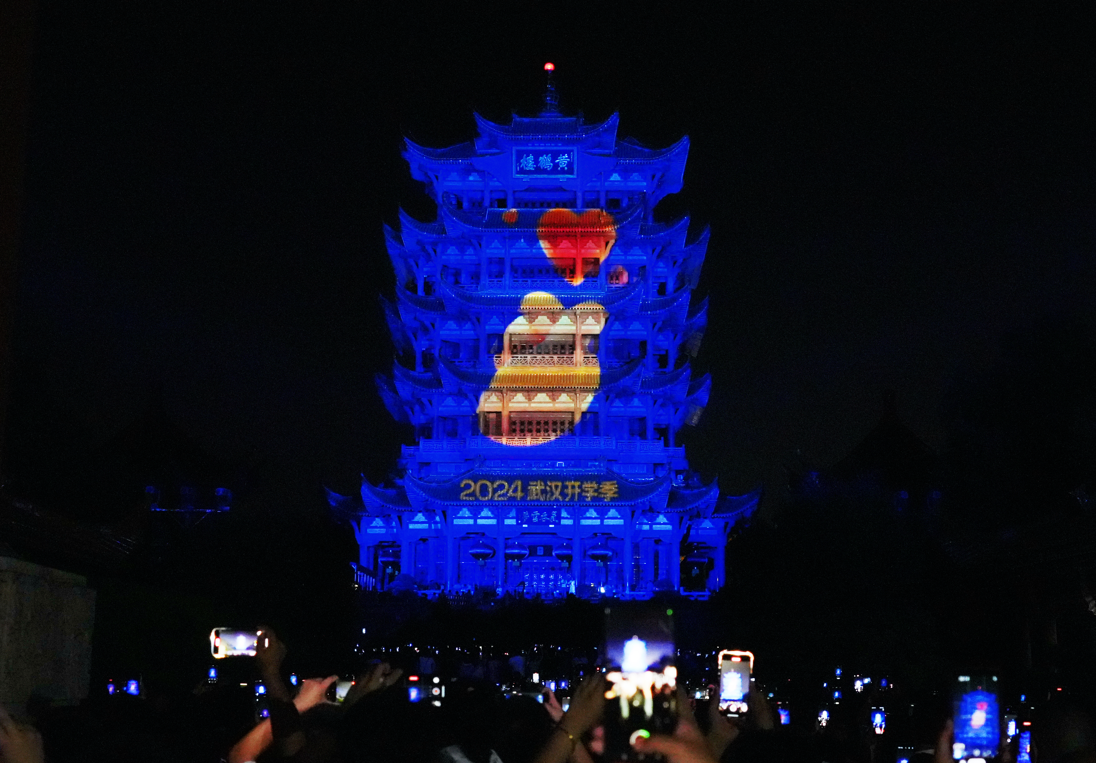 《夜上黄鹤楼》“武汉开学了”的主题灯光秀闪耀江城。