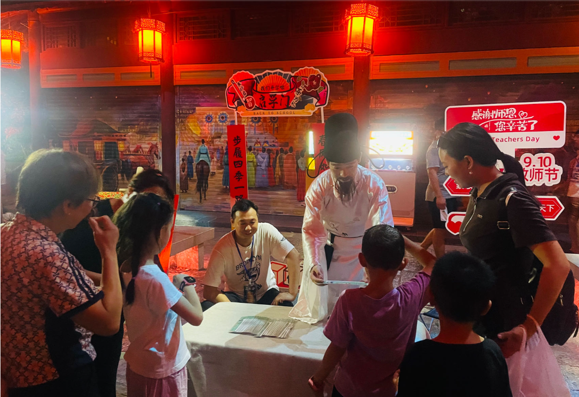 随着当晚第一场光影秀落下帷幕,武昌区中华路小学三年级学生身着古装,在黄鹤楼前展示一场敬师仪式和吟诵《弟子规》。而在园区诗歌创作角,“李白”与“状元郎”同小朋友们对诗、接成语,热闹非凡。