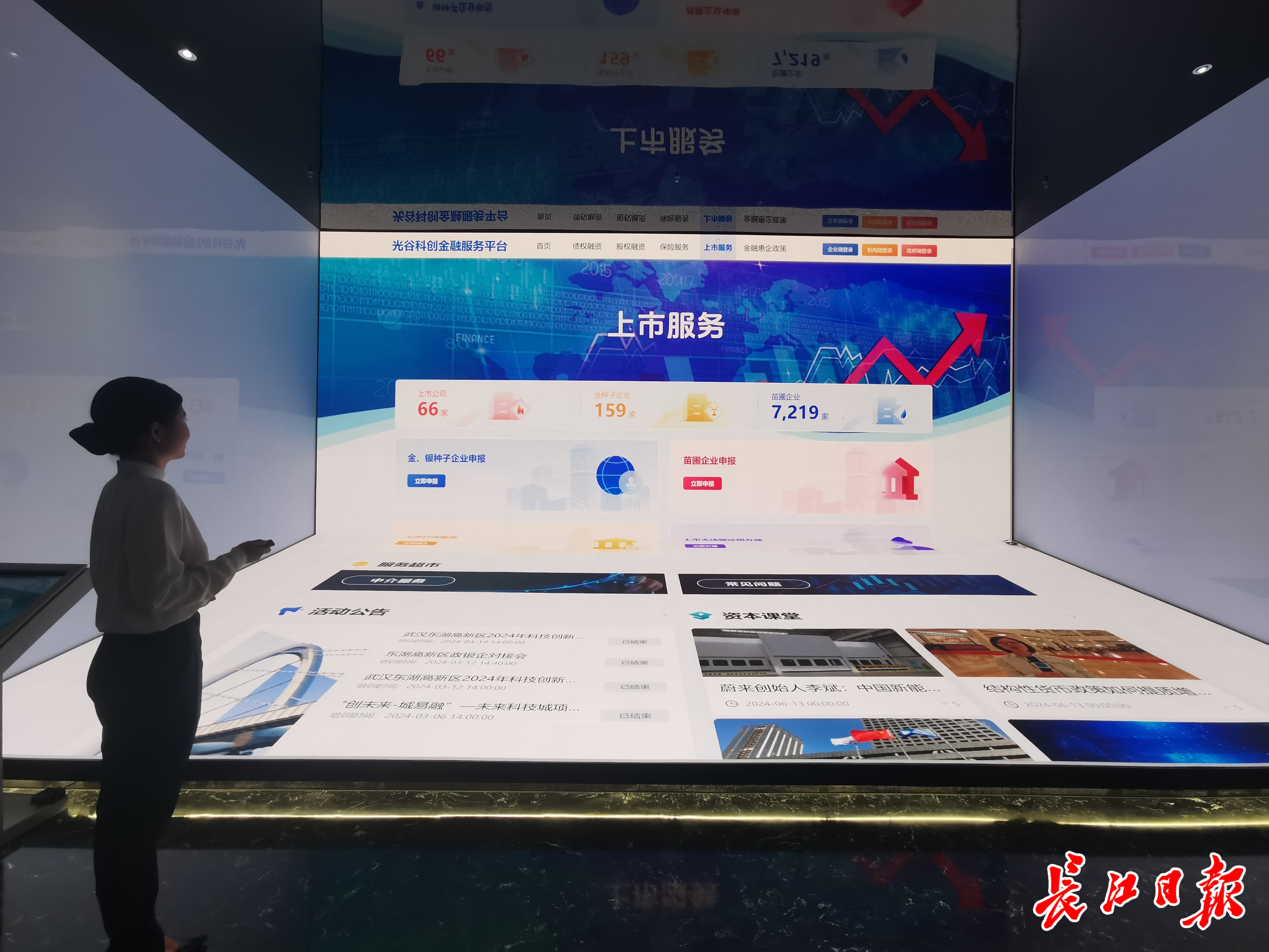 该基地位于高新大道和光谷五路交会口,总面积2500平方米,去年8月揭牌。记者来到现场看到,基地内设置了共享办公区、机构办公区、咖啡厅、路演厅等设施,办公区设有100余家银行、证券、创投等各类市场化机构入驻。在展厅里,设有金融驾驶舱、科创金融实验室等线上平台,提供线上线下一站式服务。