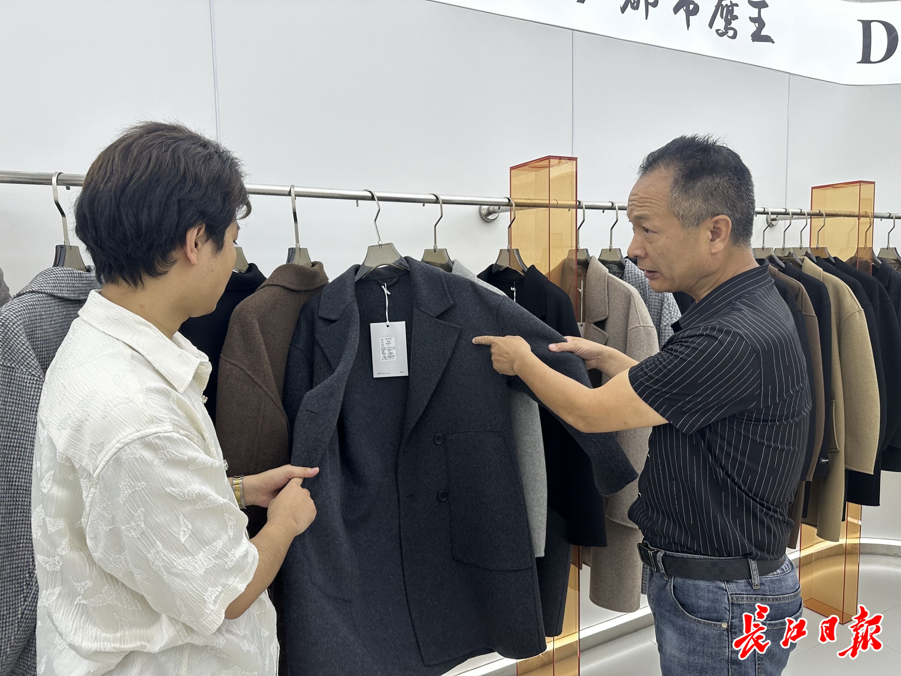殷建传(右)、殷高原父子交流服装趋势。长江日报记者 张衡 摄