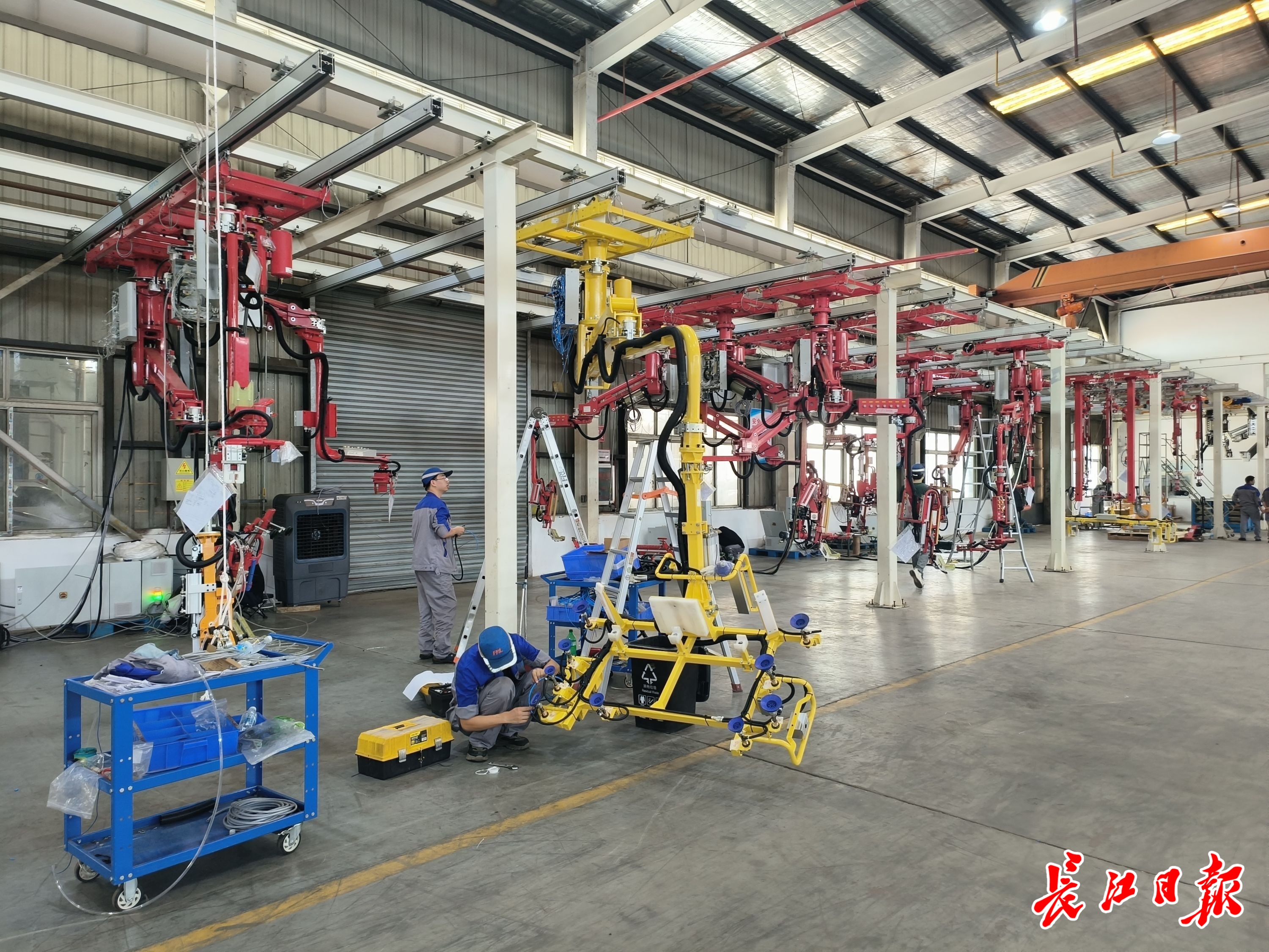 9月4日上午,长江日报记者走进位于武汉经开区的武汉孚锐利,焊接区、装配区、调试区一派繁忙。调试区内,多名技术人员正在为一字排开的各种机械臂做出厂前的最后检测。据悉,这些机械臂是杭州钱塘某新能源工厂总装需要的所有助力设备。