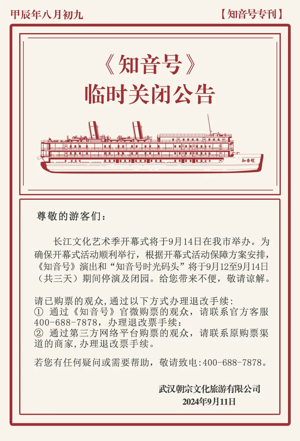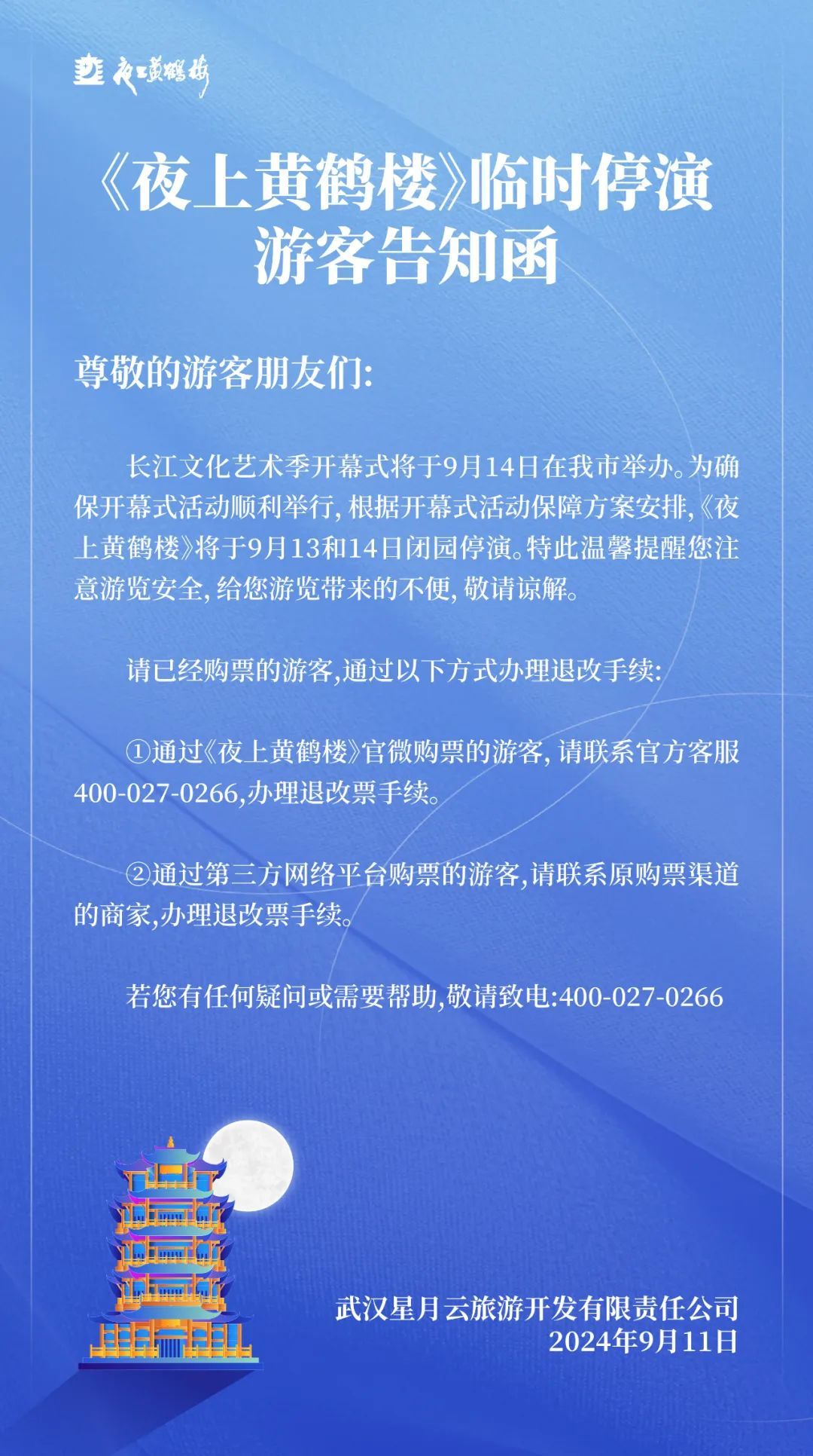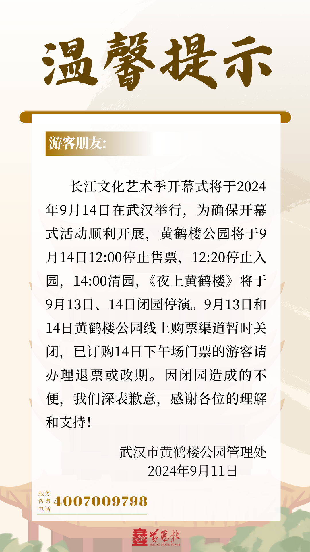 根据相关工作安排,武汉市晴川阁管理处(武汉大禹文化博物馆)拟于2024年9月13日(周五)暂停夜游开放,9月14日(周六)全天闭馆(白天和夜游均不开放),9月15日(周日)恢复正常预约开放。请各位游客朋友合理规划出行,给您带来不便,敬请谅解。