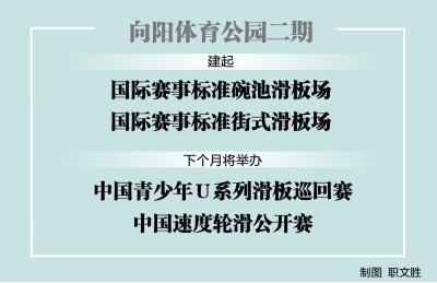 去年10月,向阳体育公园二期开工。通过移树整地,这片场地建起国际赛事标准碗池滑板场和标准街式滑板场各一座。同时,原公园一期部分场馆迁移到杨泗港国博大道立交桥“桥下空间”,就地改建一座标准轮滑、真冰两用场地。