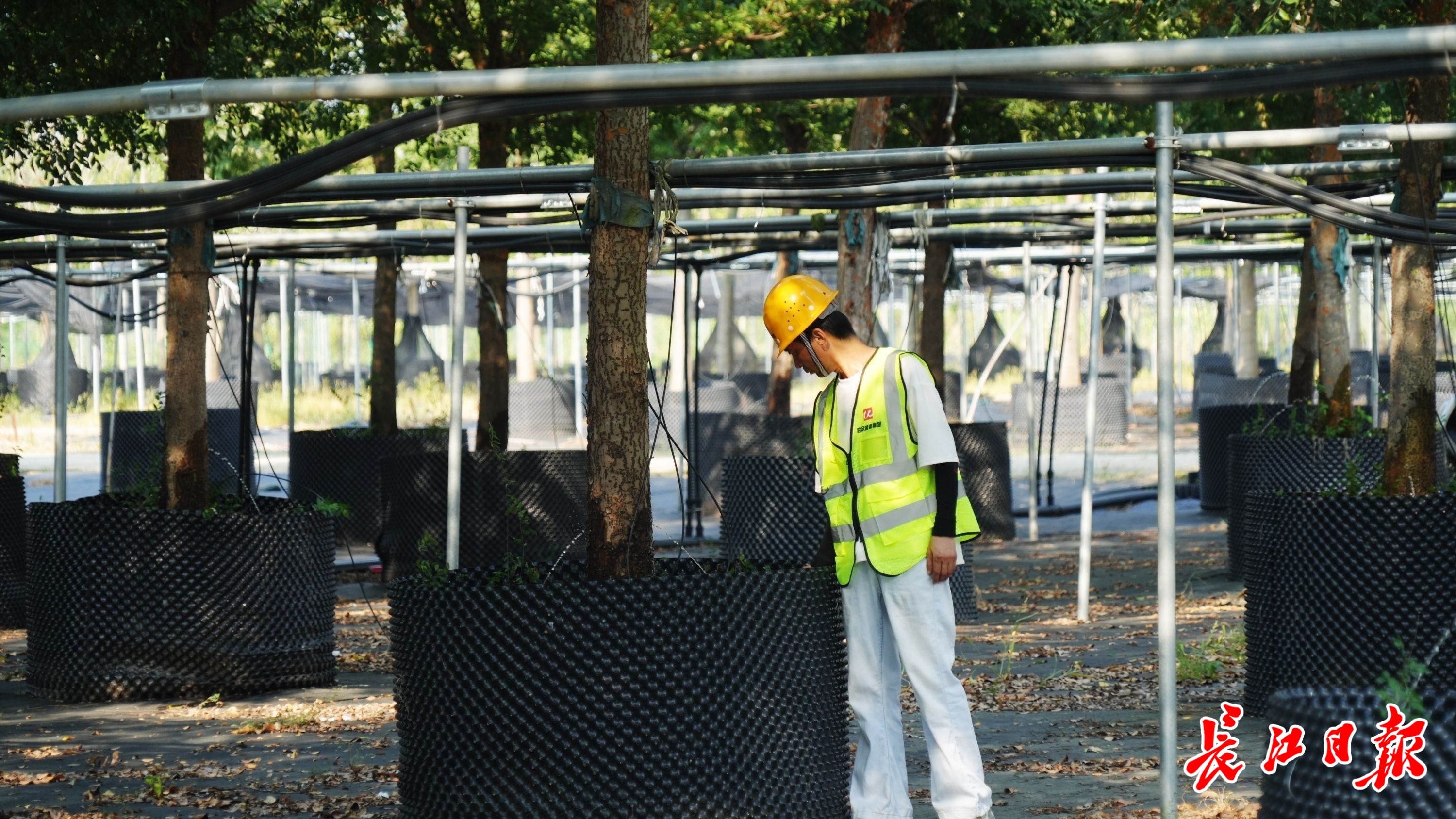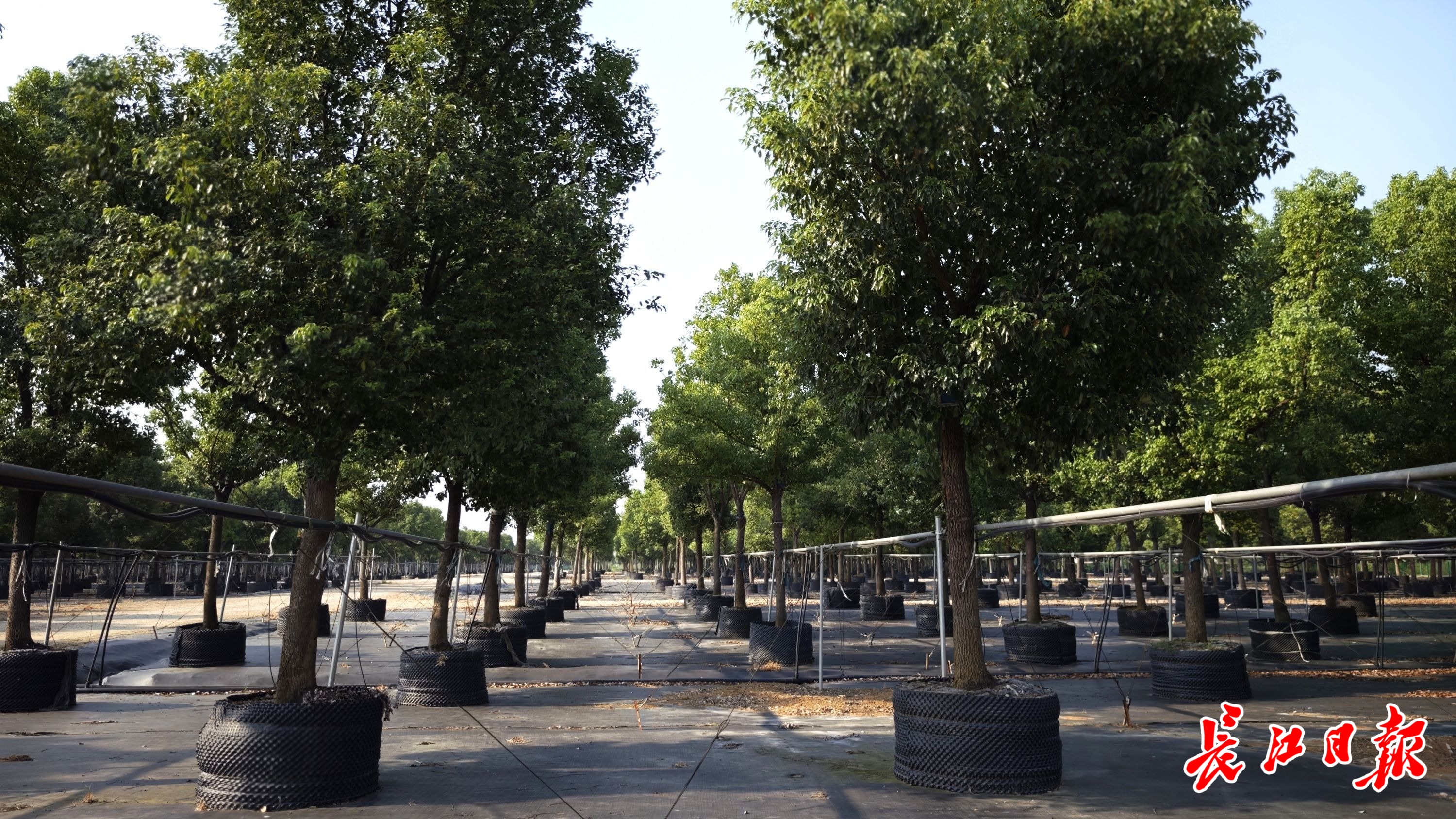走进仓埠基地,仿佛踏入了一个绿色的世界,乔木和花灌木错落有致,每一株都精神抖擞。长江日报记者细细辨认了一下,这里有香樟、榔榆、水杉,还有樱花、海棠、紫薇等,树木整齐排列,平均高度在6—10米。每棵树都种在高半米以上的黑色PVC圆筒状容器内,器壁多孔。