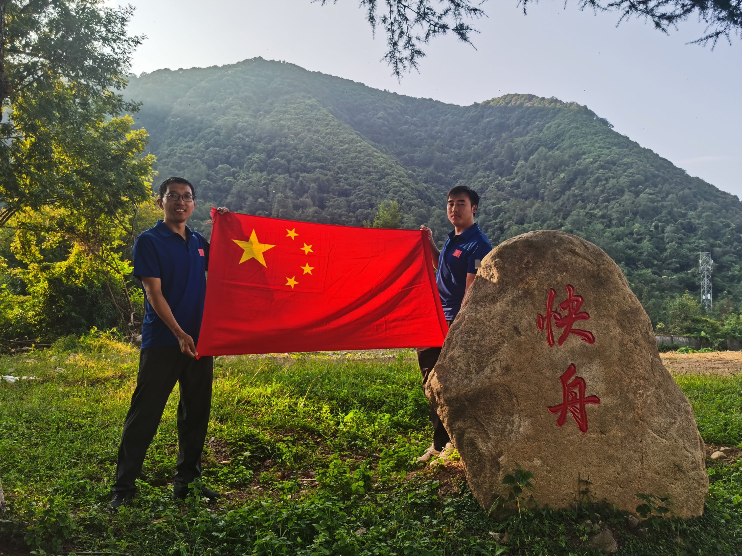 郭绍波(左)在火箭发射场的快舟纪念石前展开鲜红的国旗。