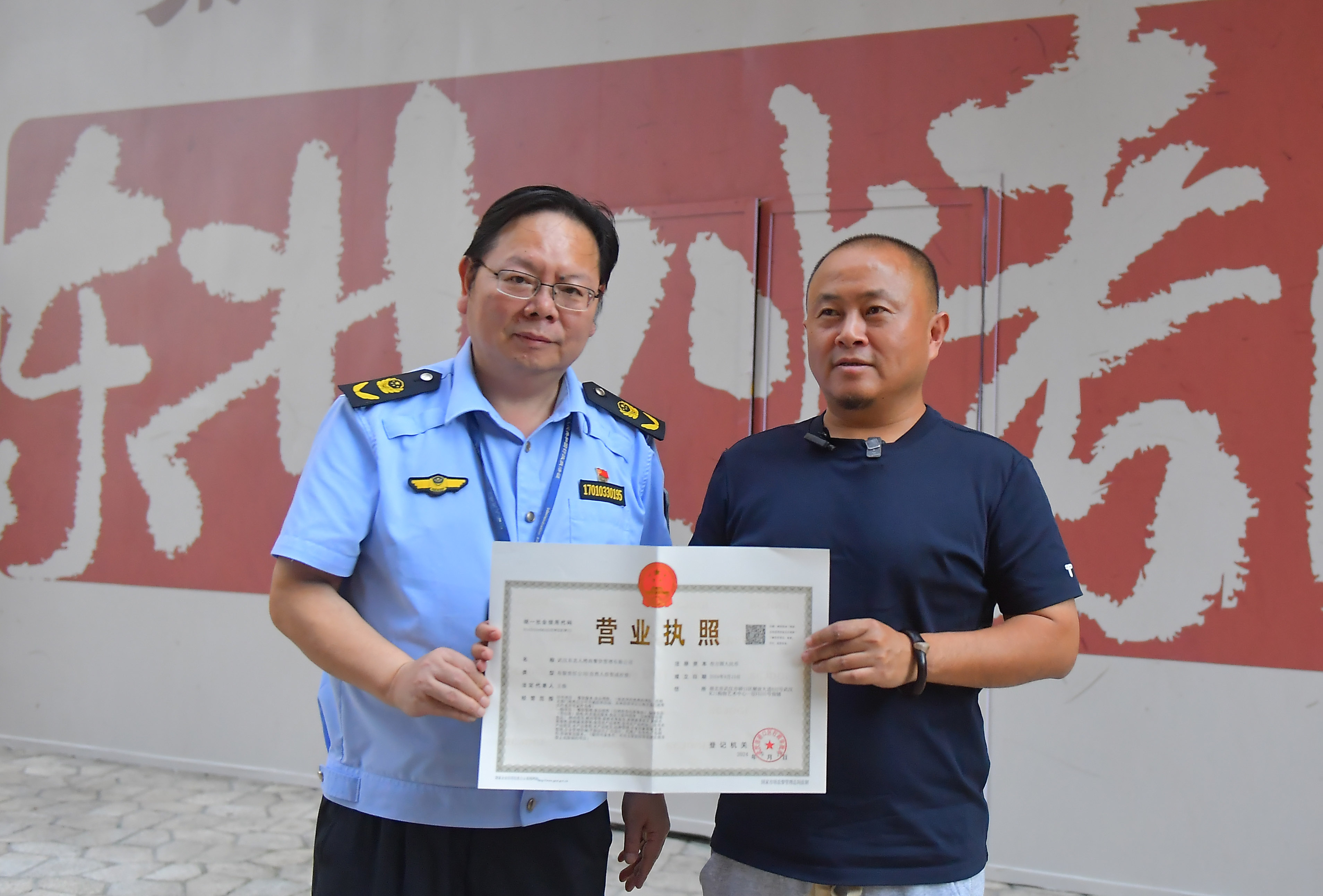23日,“70后”东北汉子王征宇从硚口区市场监管人员手中领到了一份企业营业执照。在汉扎根18年,他的东北人烤肉店从个体户升级成了餐饮企业。