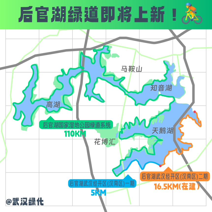 此前,后官湖绿道已建成115公里,包括沿湖段和武汉经开区(汉南区)段一期,是武汉热门打卡点之一。