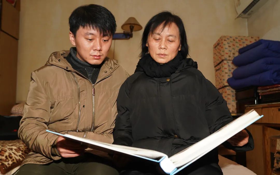 鄂红兵的妻子付莉(右)和儿子鄂靖(左)在家中查看鄂红兵的照片。通讯员孙逊 摄