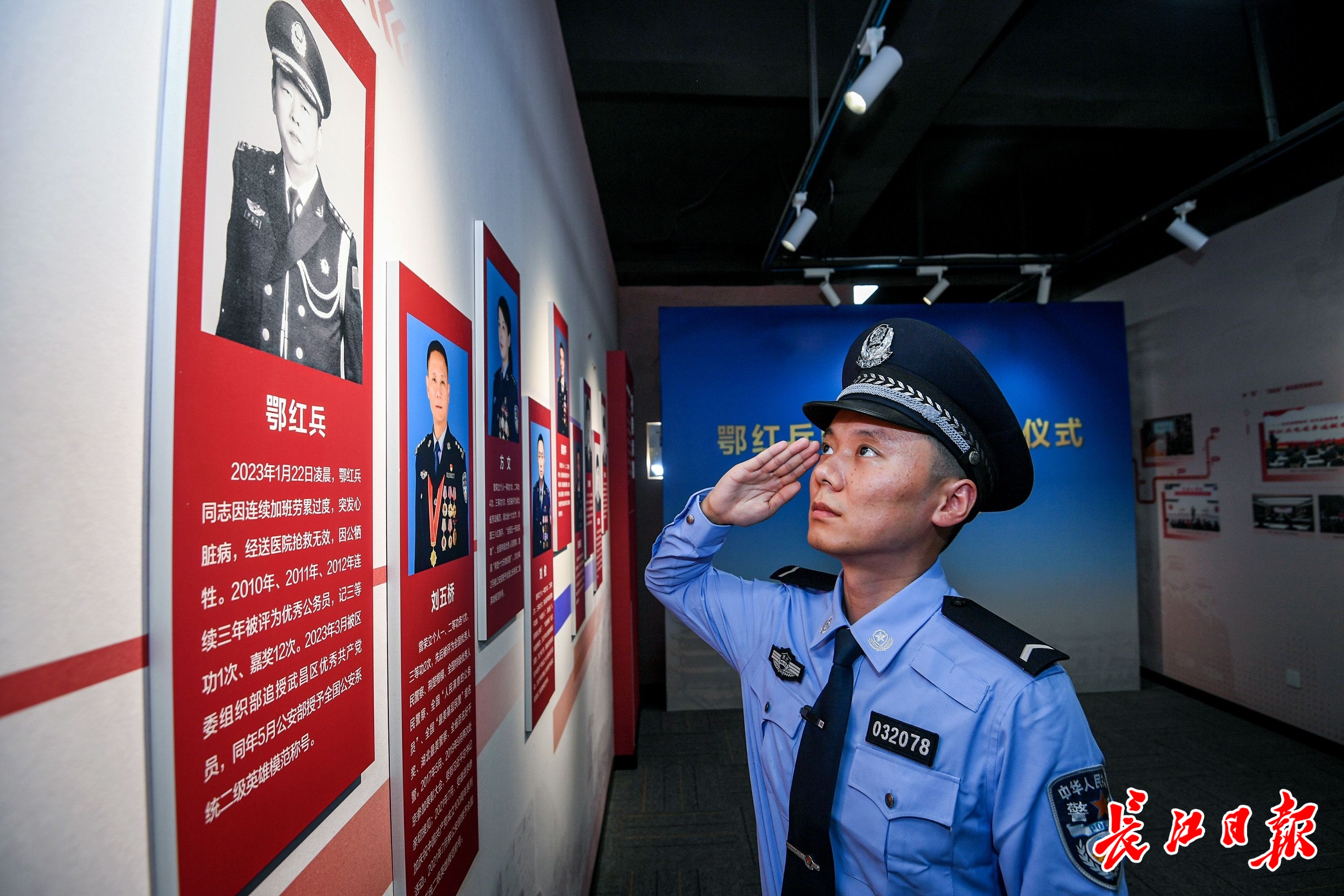 9月24日,武昌区公安分局党建活动室,刚刚戴上警号“032078”的鄂靖站在父亲鄂红兵的事迹简介前,向父亲敬礼。长江日报记者史伟 通讯员孙逊 摄