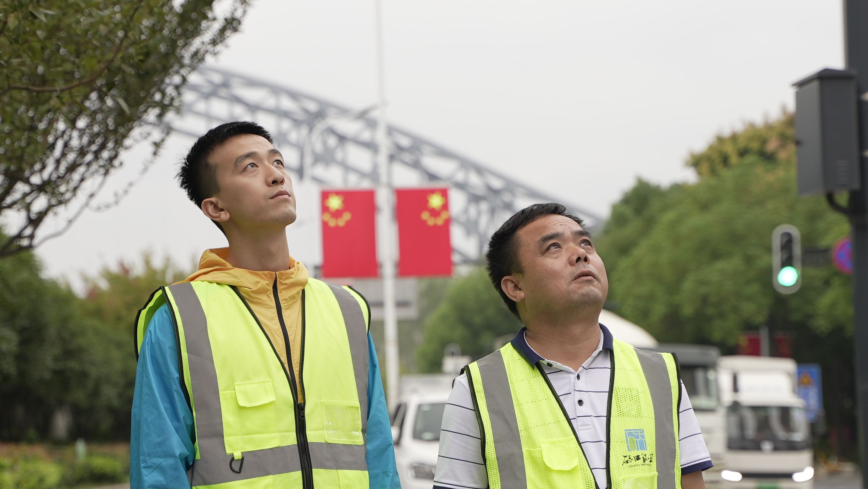 我所在的“国旗悬挂工作组”共18人,我们一般在国庆前轮流作业。2020年国庆前,我们接公司任务在硚口区主要道路旁升挂国旗,第一次升挂国旗前,大家其实都有些紧张,因为都来自不同的岗位没有经验,比如我,就是从事道桥维修的。