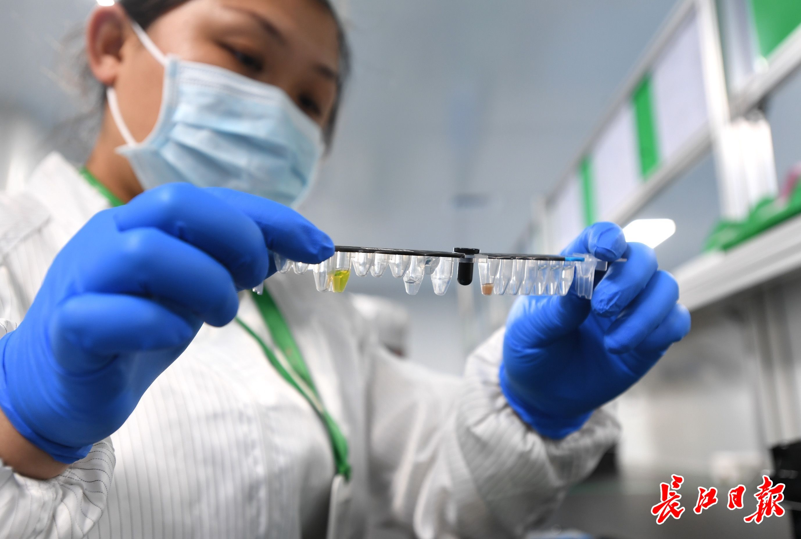 武汉明德生物科技股份有限公司技术人员在聚精会神检查化学发光试剂条外观(资料图片)。长江日报记者高勇 摄