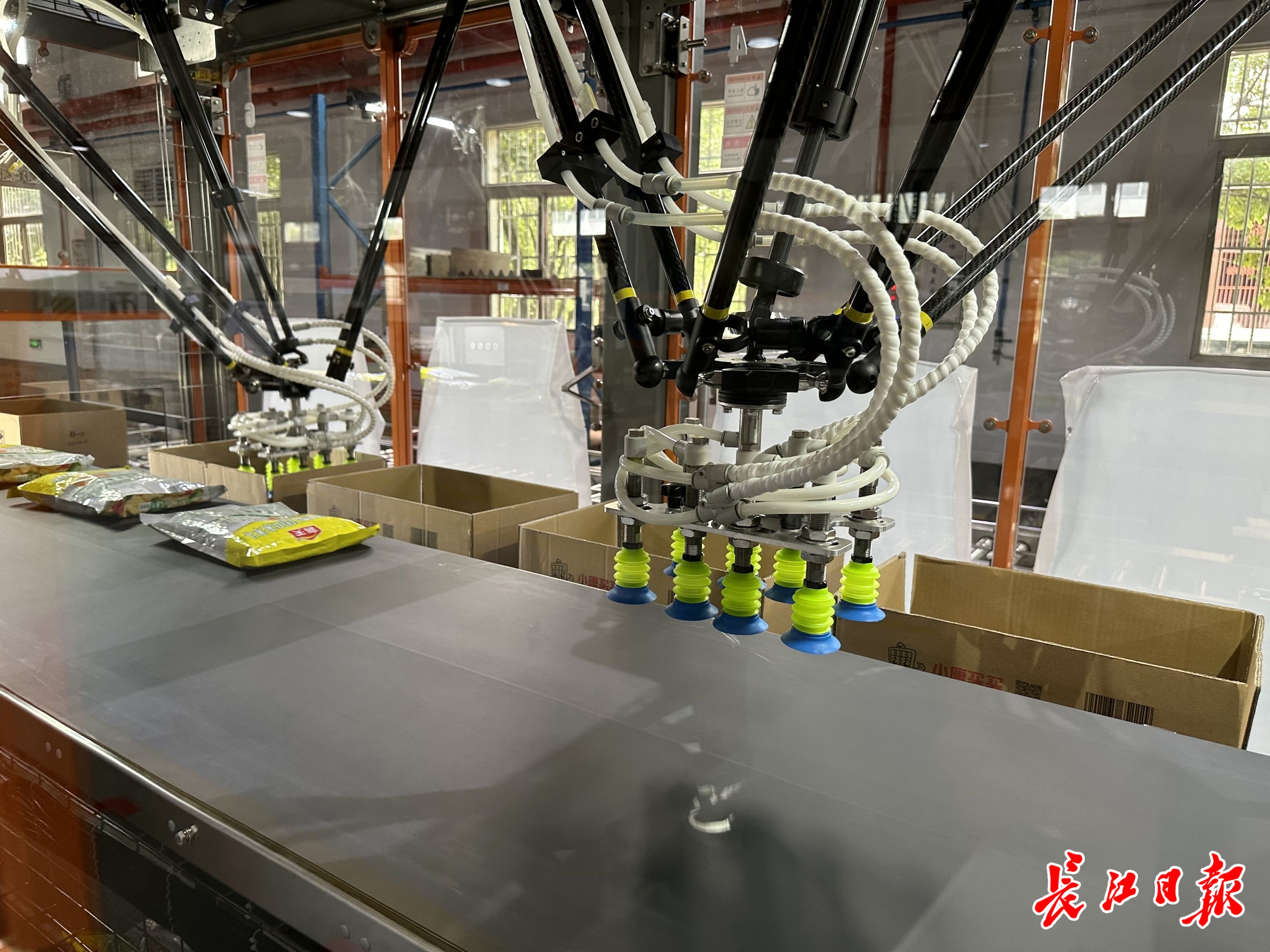 长江日报大武汉客户端讯(记者冯雪)5000平方米的厂房内,机器人“员工”正在紧张作业——袋装调味品被送上传送带,落入等候在一旁的机器人“巨掌”之中,被以完美的阵列摆放于包装箱内。随着箱盖轻轻合上,密封条瞬间黏合,包装箱踏上另一条传送带,向着堆垛区进发。在堆垛区,约一平方米大小的托盘上,上百个包装箱被机器人手臂稳稳当当地堆叠起来,这些满载货物的托盘自动驶入仓库深处。9月20日下午,长江日报记者来到武汉人天包装自动化技术股份有限公司(以下简称“人天包装”)的后道包装设备研发工厂,见到了这样一幕。