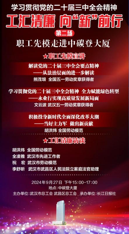 长江日报大武汉客户端9月26日讯(记者刘克取 通讯员马莉莉)明日(27日)下午3时,由武汉市总工会、武昌区工会联合主办,长江日报社承办的“工汇清廉 向‘新’前行”第二场主题活动开启,来自全市近60名职工先模代表走进中碳登大厦,深度感受武汉生态文明新成就。