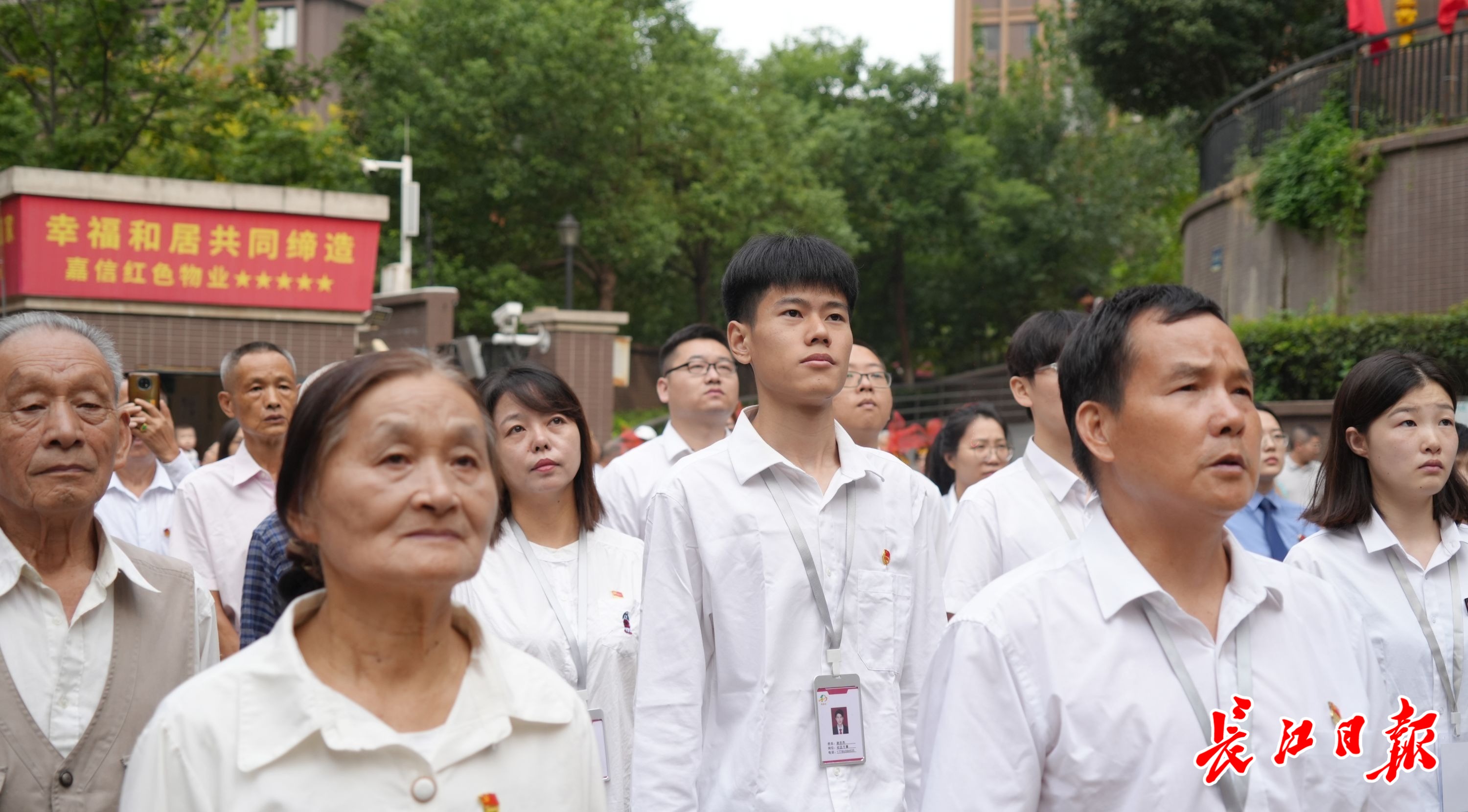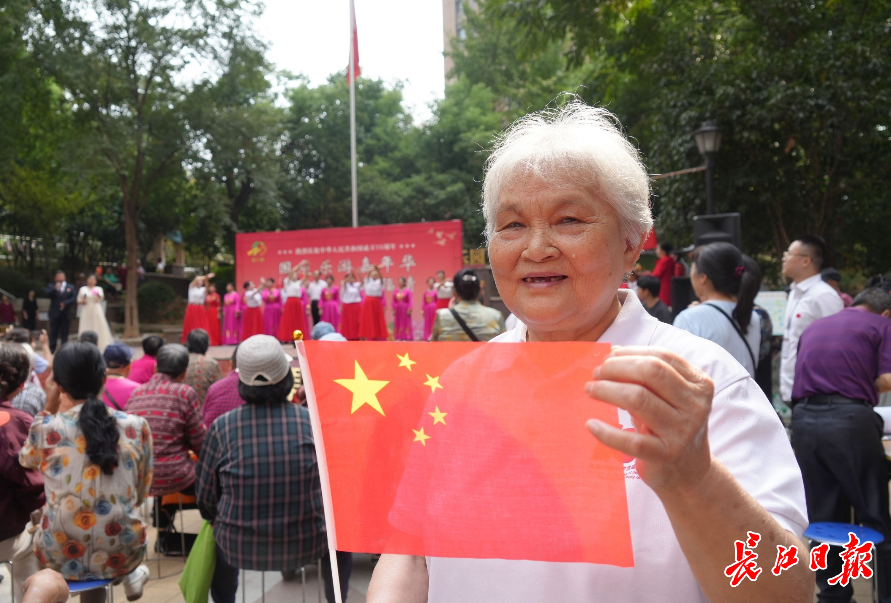 长江日报大武汉客户端9月26日讯 9月26日,在青山区工人村街道青和居社区,82岁的老党员毕旺娣如约来到东区广场,与百余居民一起参加升旗仪式。当年提议在社区树立旗杆的毕旺娣,连续4年参加社区举行的迎国庆升旗仪式。