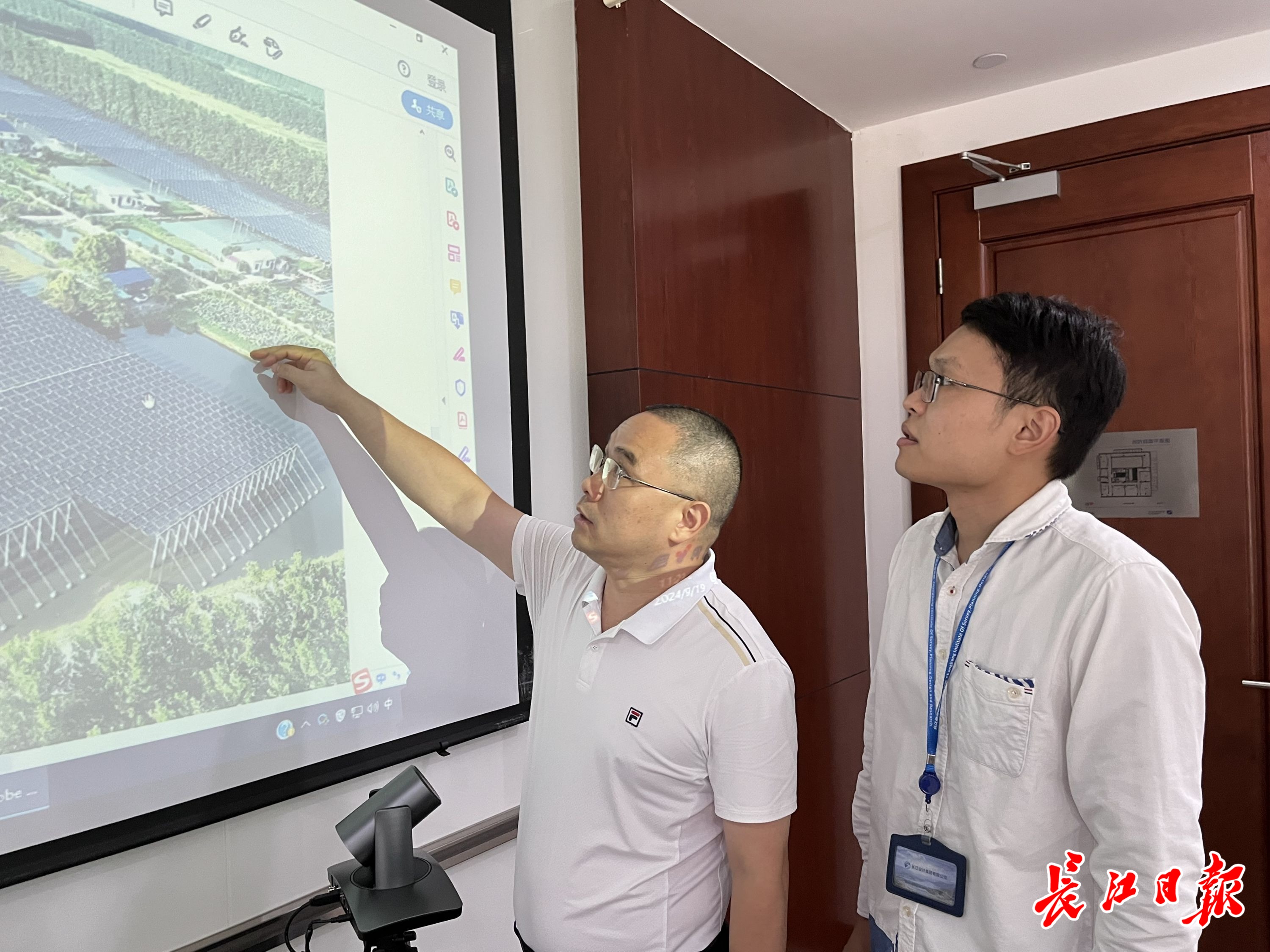 刘海波(左)与团队成员商量果园光伏项目设计构想。长江日报记者宋磊 摄