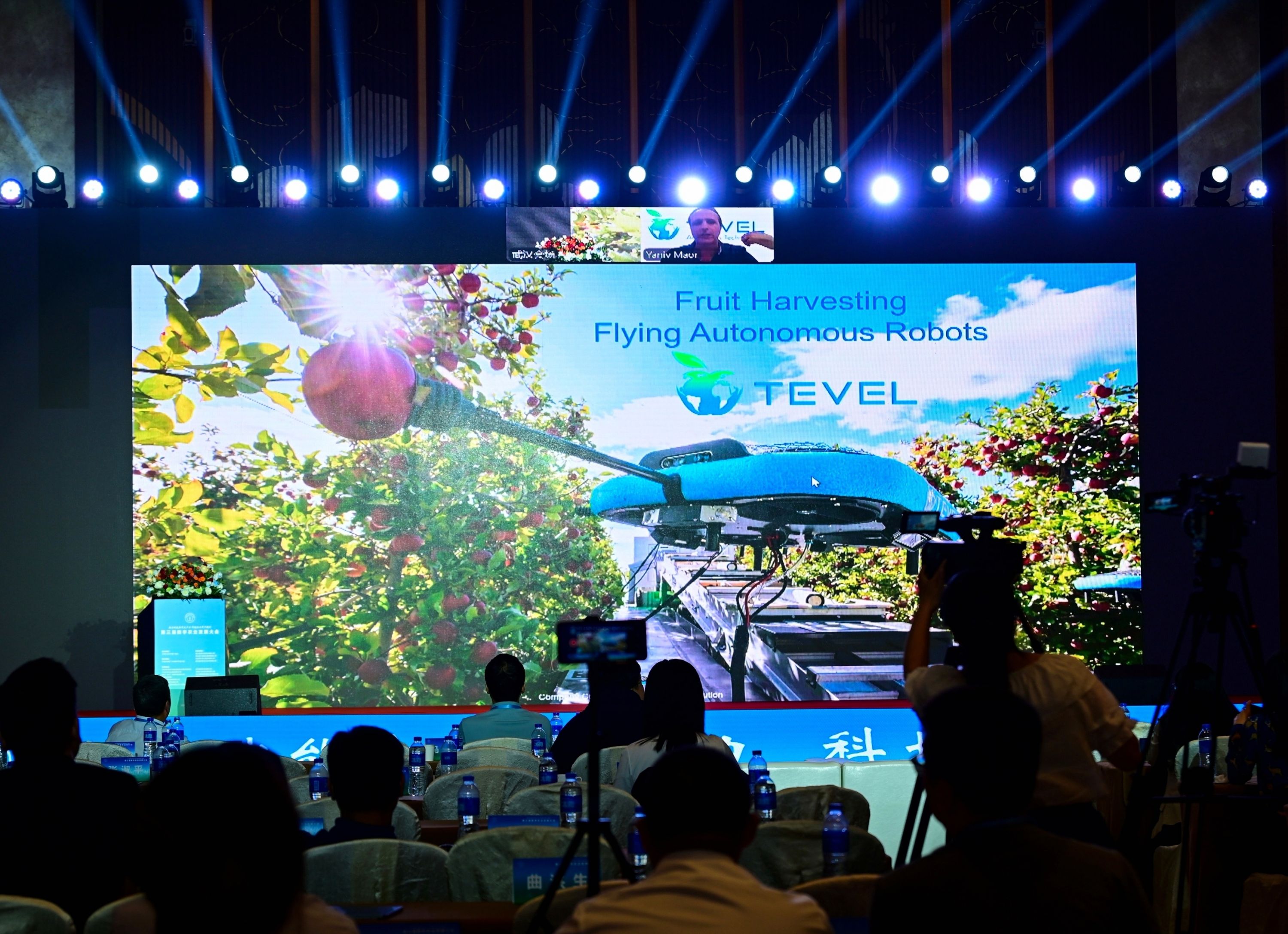 大会现场,以色列专家以连线形式分享了水果自动采摘无人机的运用。