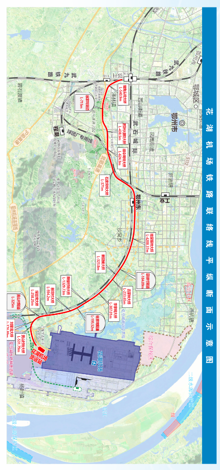 花湖机场铁路联络线位于湖北省鄂州市境内,西接武九铁路鄂州站并入国家高铁网络,东端于花湖机场南侧设置货运站。该项目新建线路21.127公里,桥隧比62.96%,投资估算总额21.85亿元,建设总工期3年,预留高铁快运发展条件。